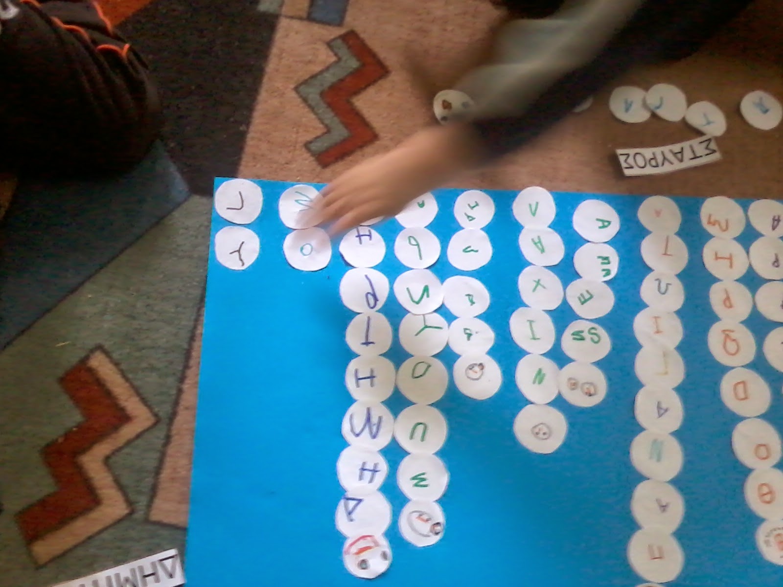 Μια εργασία που μου αρέσει είναι οι χιονάνθρωποι με τα γράμματα του ονόματός τους. Κάθε παιδί παίρνει την καρτέλα του και πολλούς άσπρους κύκλους. Κάθε κύκλος και ένα γράμμα. Και ένα κύκλος για το κεφάλι. Κατόπιν κολλάει τα γράμματα για να συνθέσει το όνομά του. Φέτος για να τους δυσκολέψω τους έβαλα να αρχίσουν από το τελευταίο γράμμα. Δεν μπορώ να πω ότι αντιμετώπισαν ιδιαίτερες δυσκολίες.