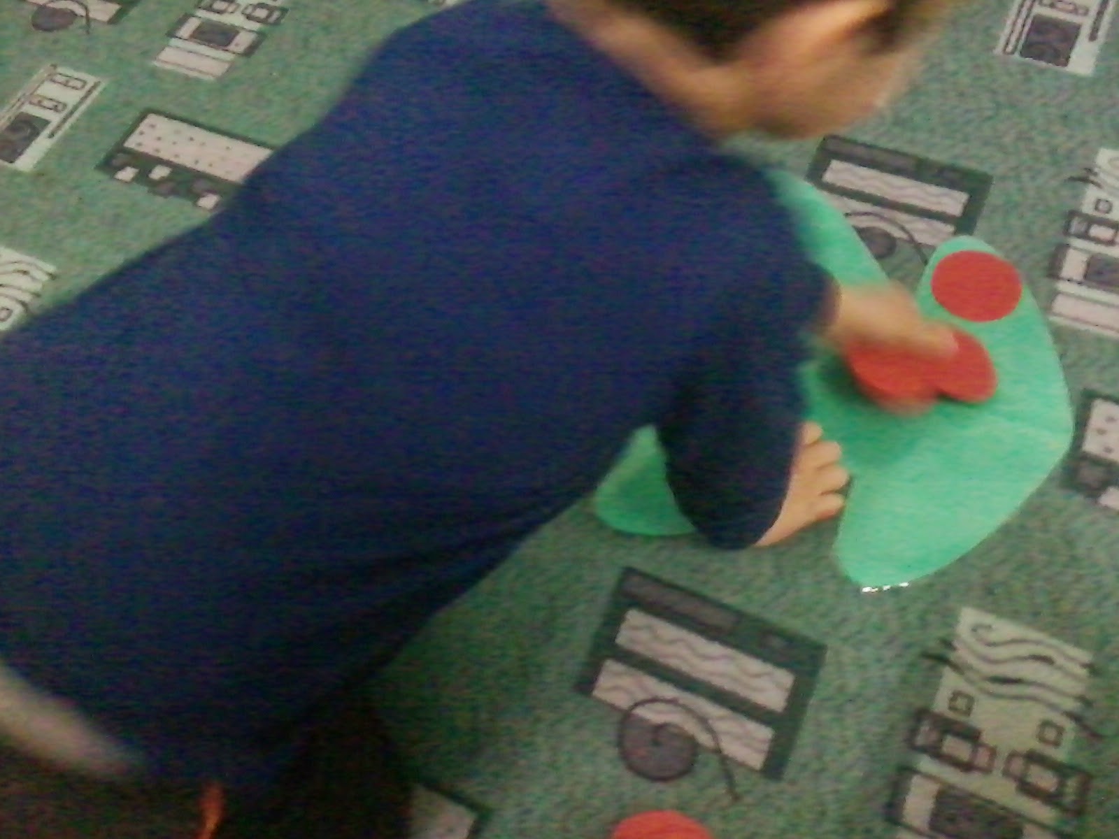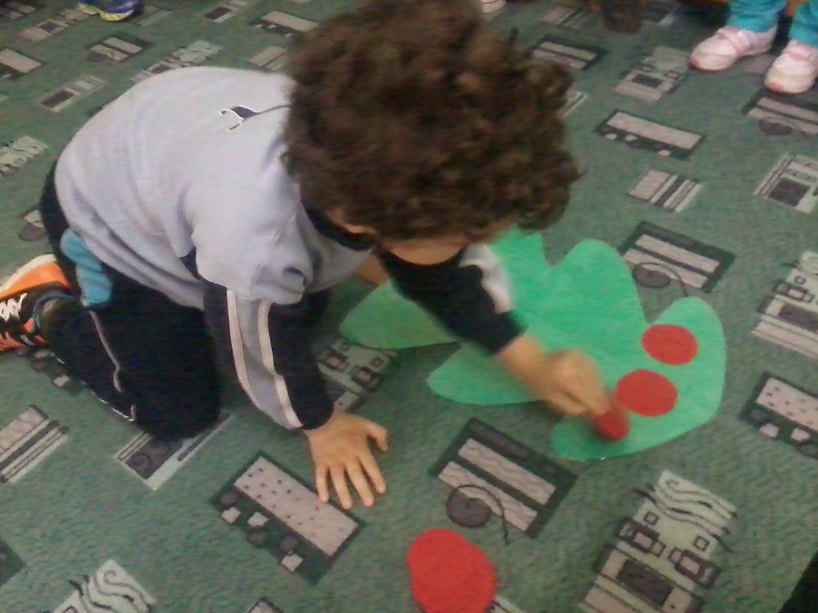 Πάνω σε ένα έλατο που έχω πλαστικοποιήσει τα παιδιά καλούνται να τοποθετήσουν κόκκινες μπάλες όσες λέει το ζάρι που ρίχνουν. Σήμερα στην αρχή δούλεψαν όλοι μαζί αλλά επειδή οι μεγάλοι τα ήξεραν και άρχισαν να βαριούνται τους έδωσα άλλο δέντρο και ένα ζάρι με τους αριθμούς από το 6-7 και εγώ έμεινα με τους μικρούς και τους αριθμούς από το 1 έως το 5.