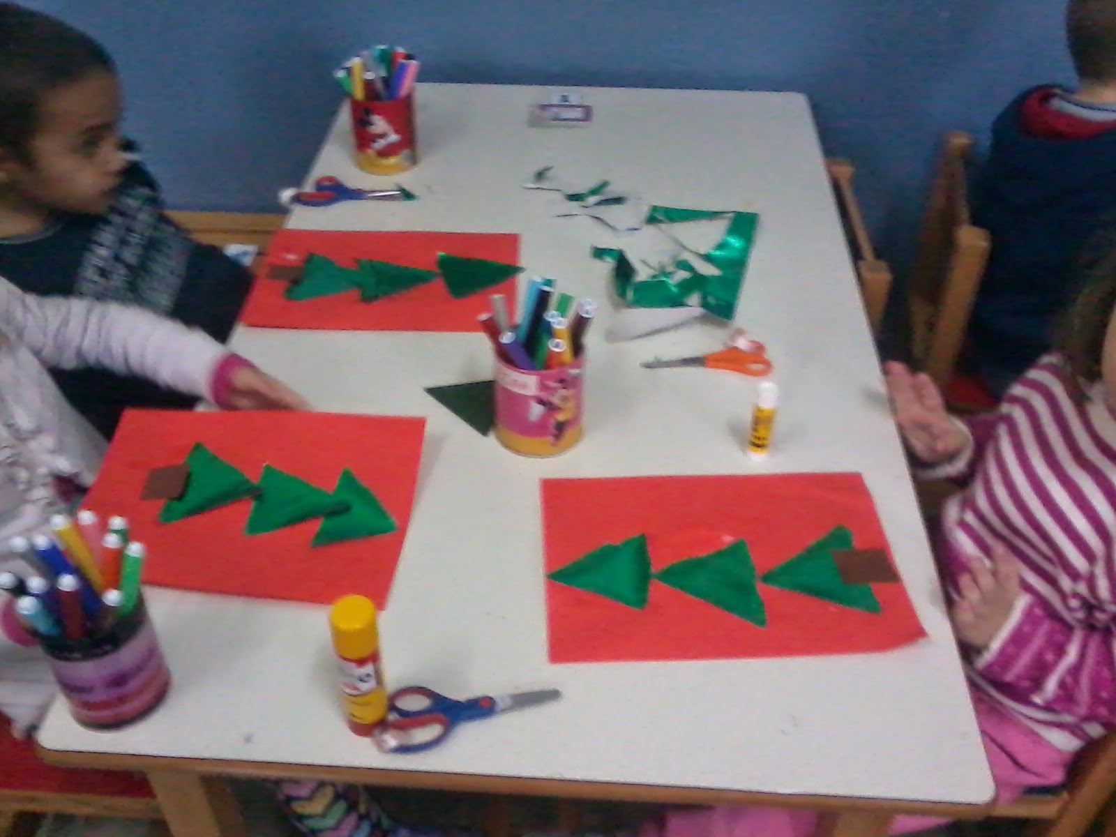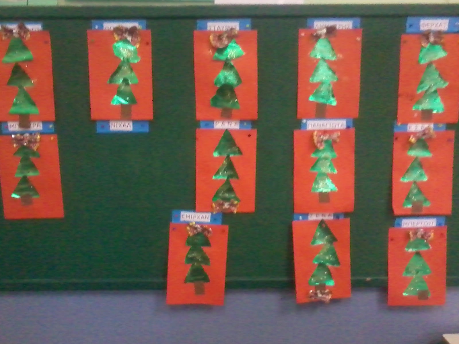 Ένα χριστουγεννιάτικο δέντρο με σχήματα. Πώς θα μπορούσαμε να κάνουμε ένα χριστουγεννιάτικο δέντρο με σχήματα; Με πολλά τρίγωνα και ορθογώνιο ήταν η απάντηση. Ευκαιρία να το δούμε. Έτσι κάθε παιδί έκοψε τρίγωνα ξεπατικώνοντας σχήματα και ορθογώνια.