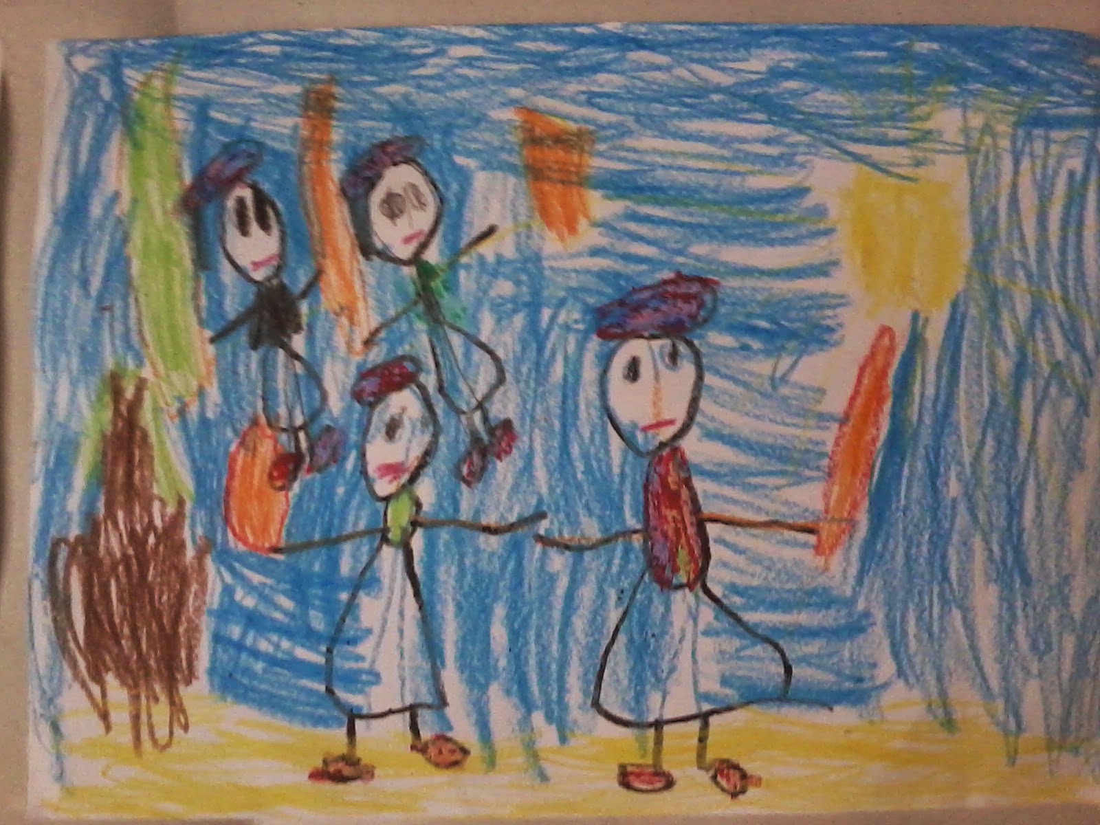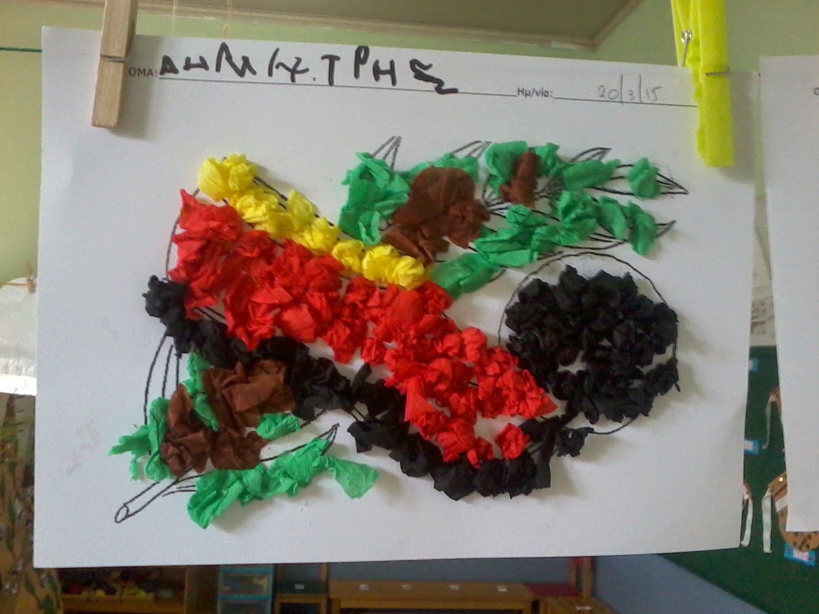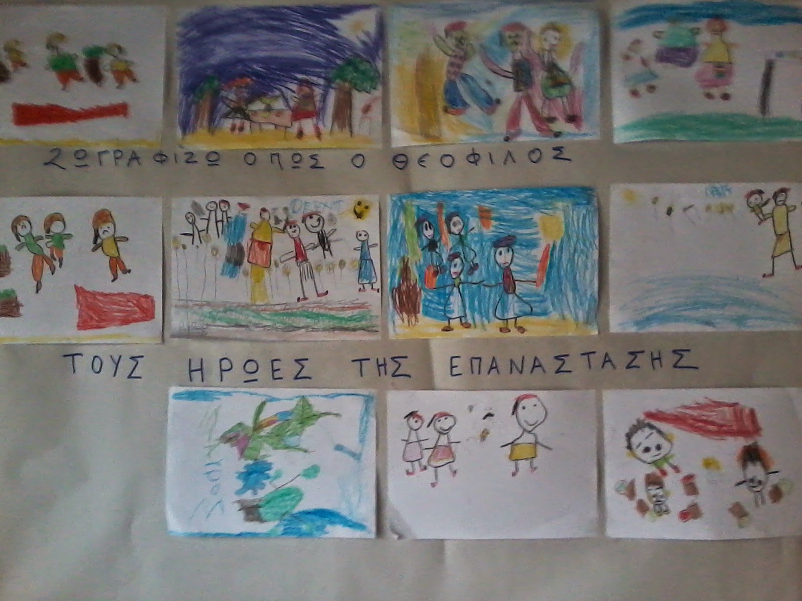 Μαθαίνοντας το τραγούδι “10 παλικάρια στήσανε χορό” για τη γιορτούλα μας αναγνώρισαν τα ονόματα των ηρώων και έμαθαν για τον Θεόφιλο, το ζωγράφο της λαϊκής μας παράδοσης. Είδαμε πίνακές του στο διαδίκτυο και προσπάθησαν να ζωγραφίσουν σαν αυτόν.