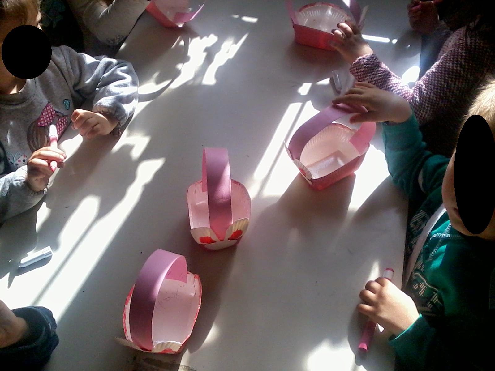 β. τα καλαθάκια μας από χάρτινο πιάτο (μια κατασκευή που προτίμησαν πολλοί συνάδελφοι). Τα παιδιά έβαψαν το πιάτο, έκοψαν τα αυτιά (πάλι από πιάτο), τα ζωγράφισαν κόλλησαν τα μάτια και ιδού