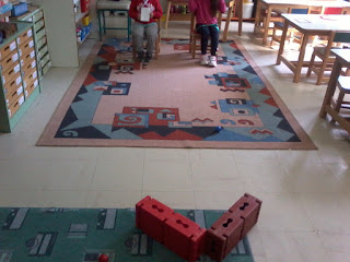 Σε όμοια χρωματιστά τουβλάκια (μικρά) έγραψα τα γράμματα του κάθε παιδιού. Κατόπιν αυτά έπρεπε, βλέποντας την καρτέλα τους, να κάνουν τον πύργο με το όνομά τους. Έτσι έπρεπε μετά να βάλουμε στη σειρά τα ονόματα από τον πιο ψηλό πύργο στο πιο χαμηλό.