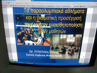 Κατόπιν συζητήσαμε ότι δεν έχει σημασία η νίκη αλλά ο Αγώνας κι έτσι όλοι μπορούν να πάρουν μέρος ακόμη και άνθρωποι που έχουν προβλήματα υγείας ή δεν μπορούν να περπατήσουν και κινούνται με αναπηρικό καροτσάκι. Είδαμε το παρακάτω Power Point και φανταστήκαμε πώς θα ήταν να ήμασταν εμείς στη θέση τους.