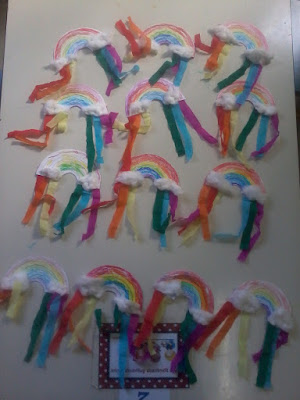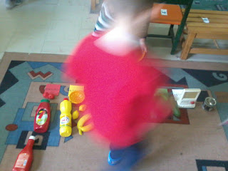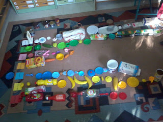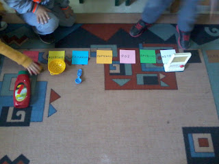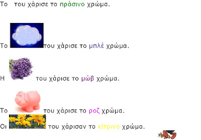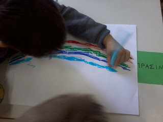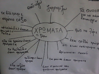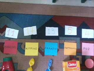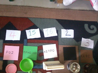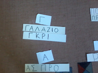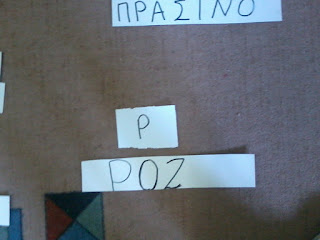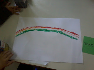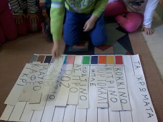 Παίξαμε με τα χρώματα. Τους έβαλα καρτέλες με τα χρώματα κάτω στο πάτωμα και έπρεπε να ψάξουν σε όλη την τάξη να βρουν και να ταξινομήσουν όποιο αντικείμενο θέλουν.