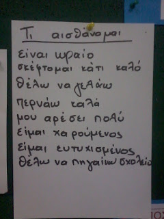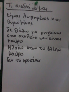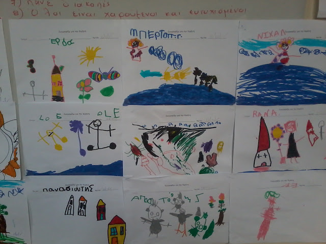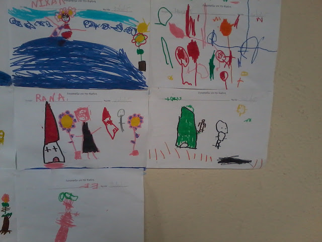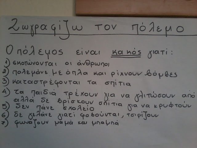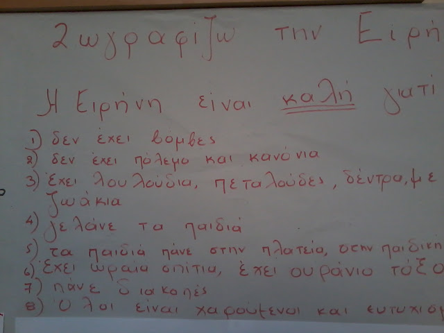 Συζητήσαμε και είδαμε χαρούμενες φωτογραφίες με ειρηνικά θέματα. Κατάλαβαν ότι εμείς εδώ που ζούμε έχουμε ειρήνη και ότι είναι καλύτερη από τον πόλεμο. Ζωγράφισαν την ειρήνη.
