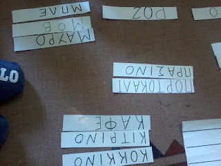 Και τέλος να το γράψουν στον υπολογιστή. Πάνω στα πλήκτρα του υπολογιστή είχα κολλήσει τα γράμματα της αλφαβήτας. Έτσι κάθε παιδί βλέποντας την καρτέλα του έγραφε το όνομά του.