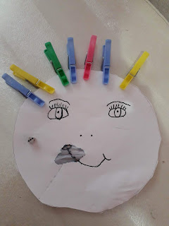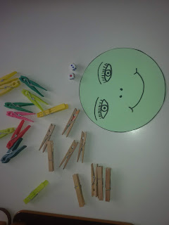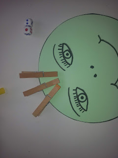 4. Παίρνουμε τα μανταλάκια της μαμάς, ρίχνουμε τα ζάρια και μετράμε με το δαχτυλάκι πόσες βουλίτσες μας δείχνουν τα ζάρια