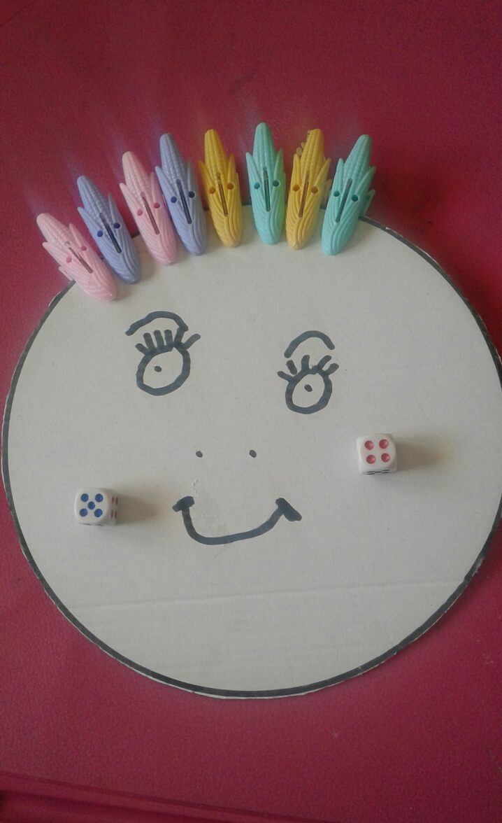4. Παίρνουμε τα μανταλάκια της μαμάς, ρίχνουμε τα ζάρια και μετράμε με το δαχτυλάκι πόσες βουλίτσες μας δείχνουν τα ζάρια