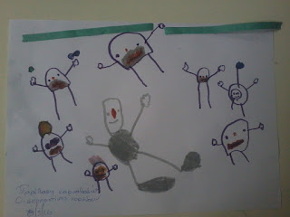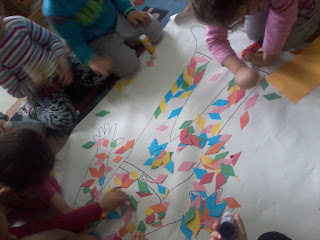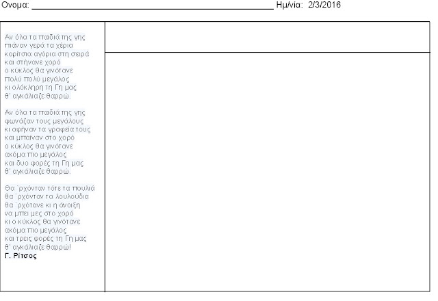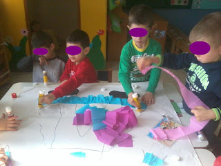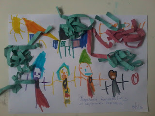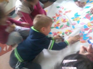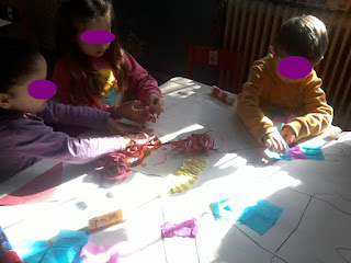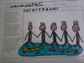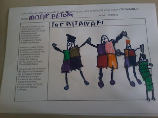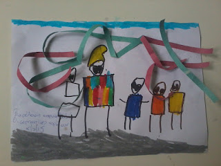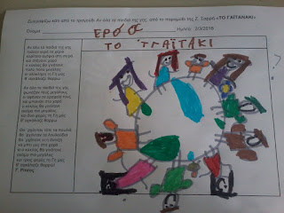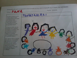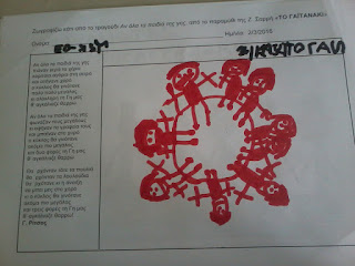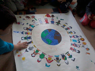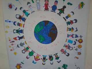 Τα παιδιά ζωγράφισαν πουλιά και λουλούδια, έβαψαν παιδιά από όλο τον κόσμο και κάναμε μια μεγάλη αφίσα με κέντρο τη γη μας. Ζήτησαν να τη βάλουμε έξω από την τάξη για να τη βλέπουν οι γονείς.