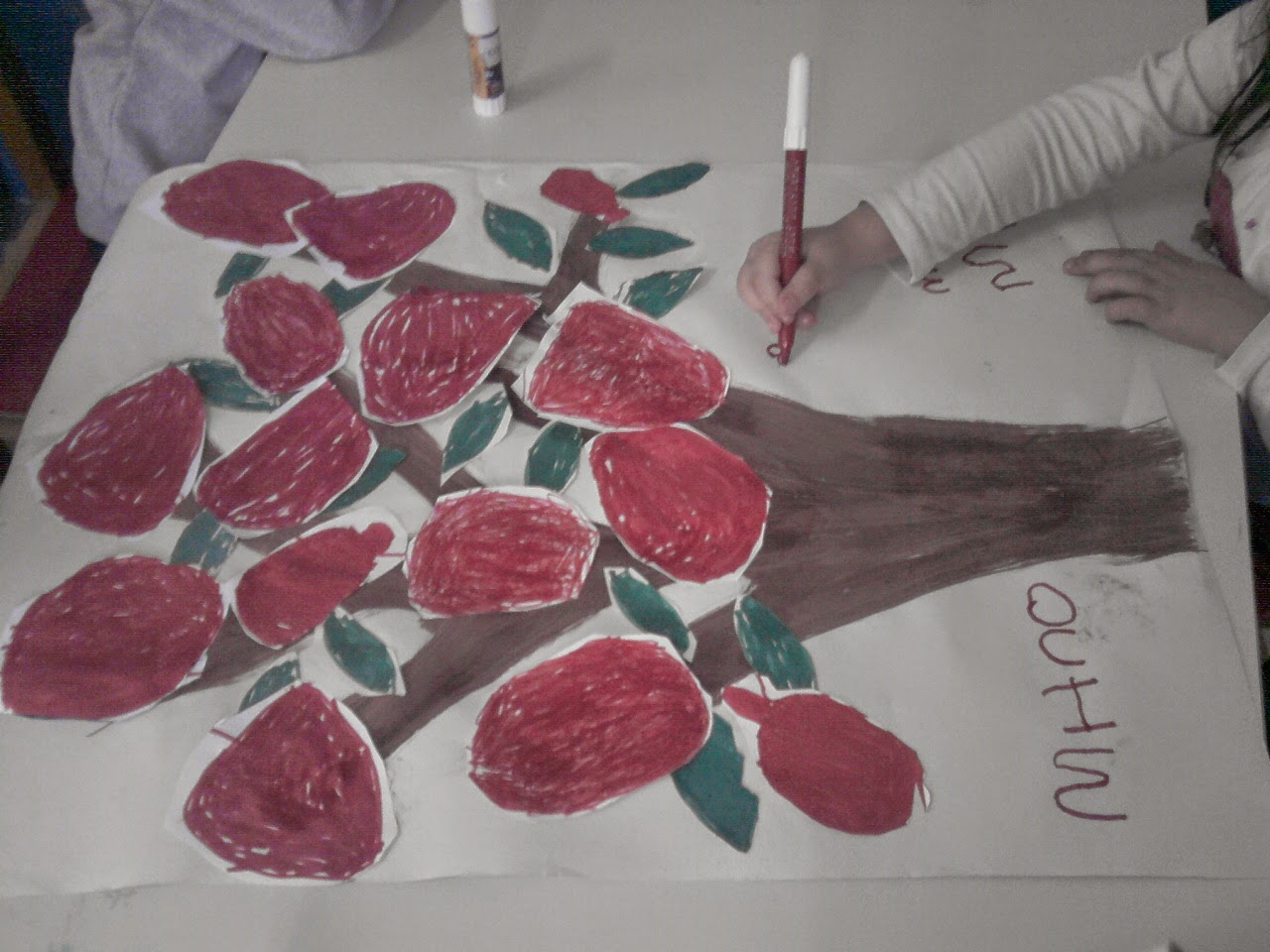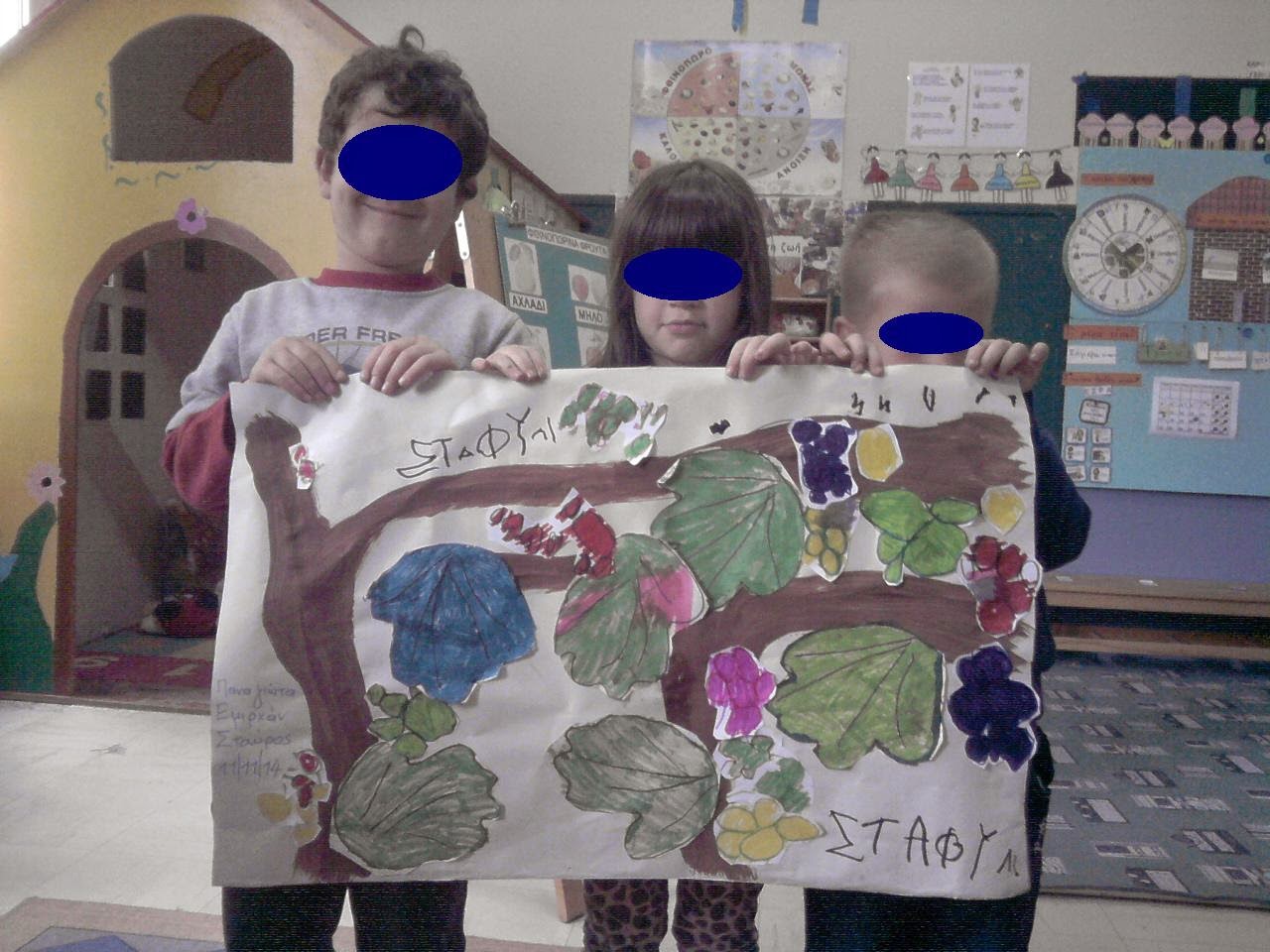 Κατόπιν συζητήσαμε πώς θα μπορούσαμε εμείς να τον ζωγραφίσουμε. Με νερομπογιές και πινέλα, με κηρομπογιές, με μαρκαδόρους, τα είπαν όλα. Αποφασίσαμε στο τέλος να χρησιμοποιήσουμε και τα τρία είδη για να τον αποτυπώσουμε.