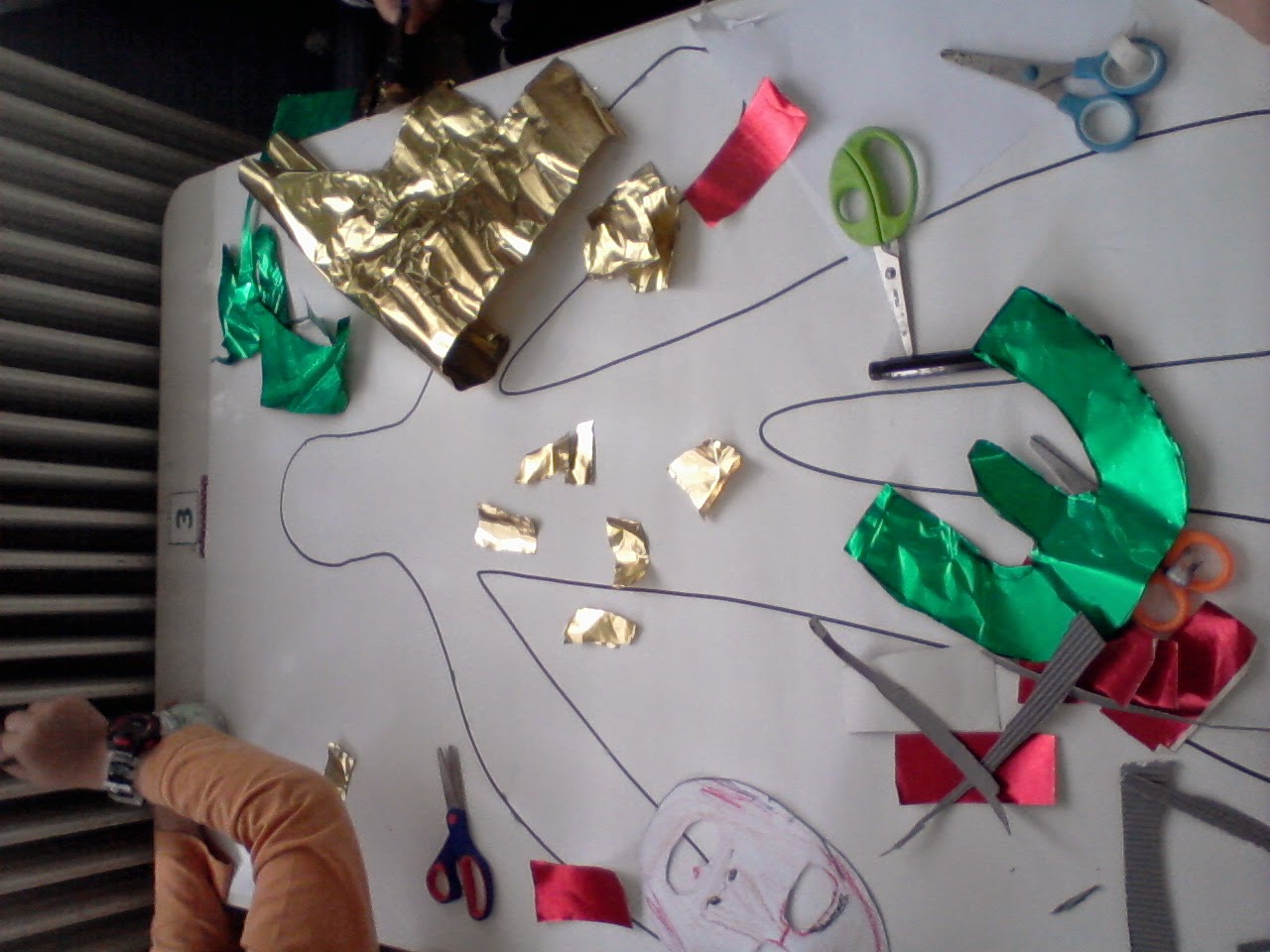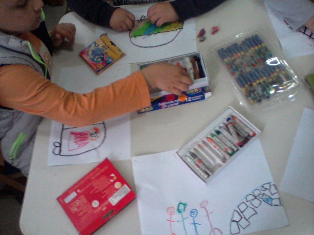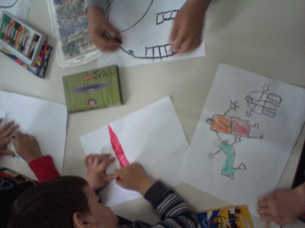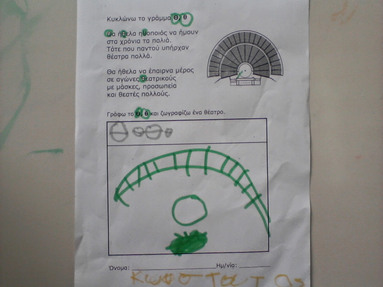 Κατόπιν αναρωτηθήκαμε τι θα βάλουμε. Κάποιο παιδί (Κων/νος) παρατήρησε ότι δεν έβαλα τη σκηνή οπότε έπρεπε να μπει. Στη συνέχεια είπαν ότι έπρεπε να βάλουμε ηθοποιούς και θεατές. Έκατσαν λοιπόν και τους ζωγράφισαν.