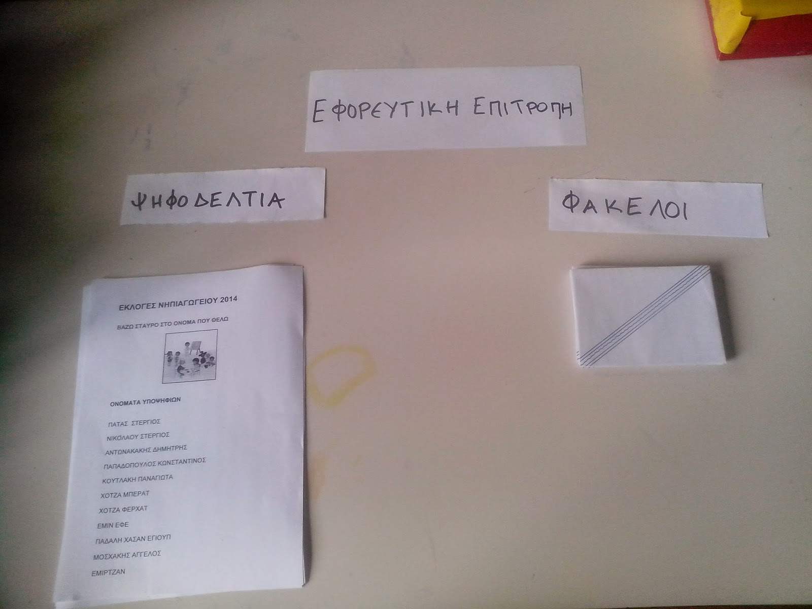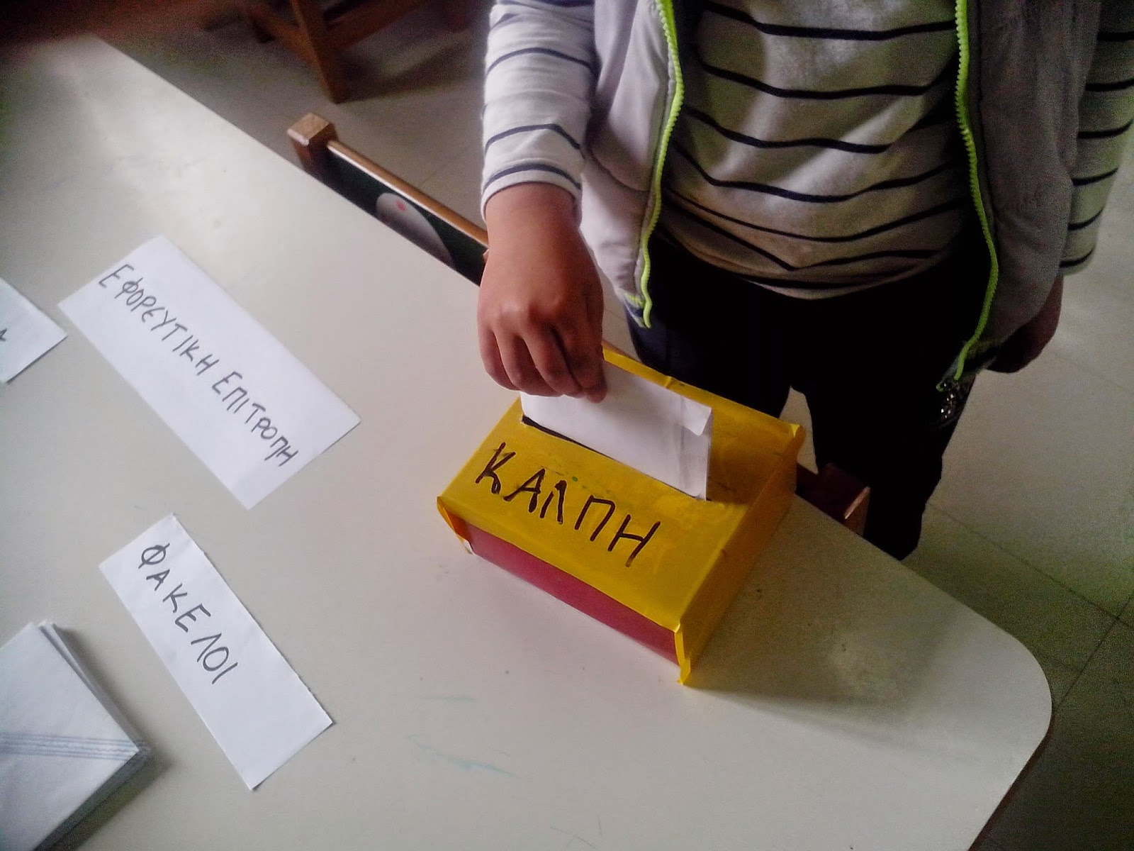 Ξεκινήσαμε λοιπόν να μάθουμε τι είναι εκλογές και να παίξουμε κι εμείς το παιχνίδι των μεγάλων. Μιλήσαμε για την ψήφο, την κάλπη, την εφορευτική επιτροπή, το ψηφοδέλτιο, τους υποψηφίους, τον σταυρό, την καταμέτρηση. Πιο ενδεδειγμένος τρόπος κατανόησης και μάθησης είναι το παιχνίδι ρόλων. Έτσι θα κάνουμε κι εμείς εκλογές.
