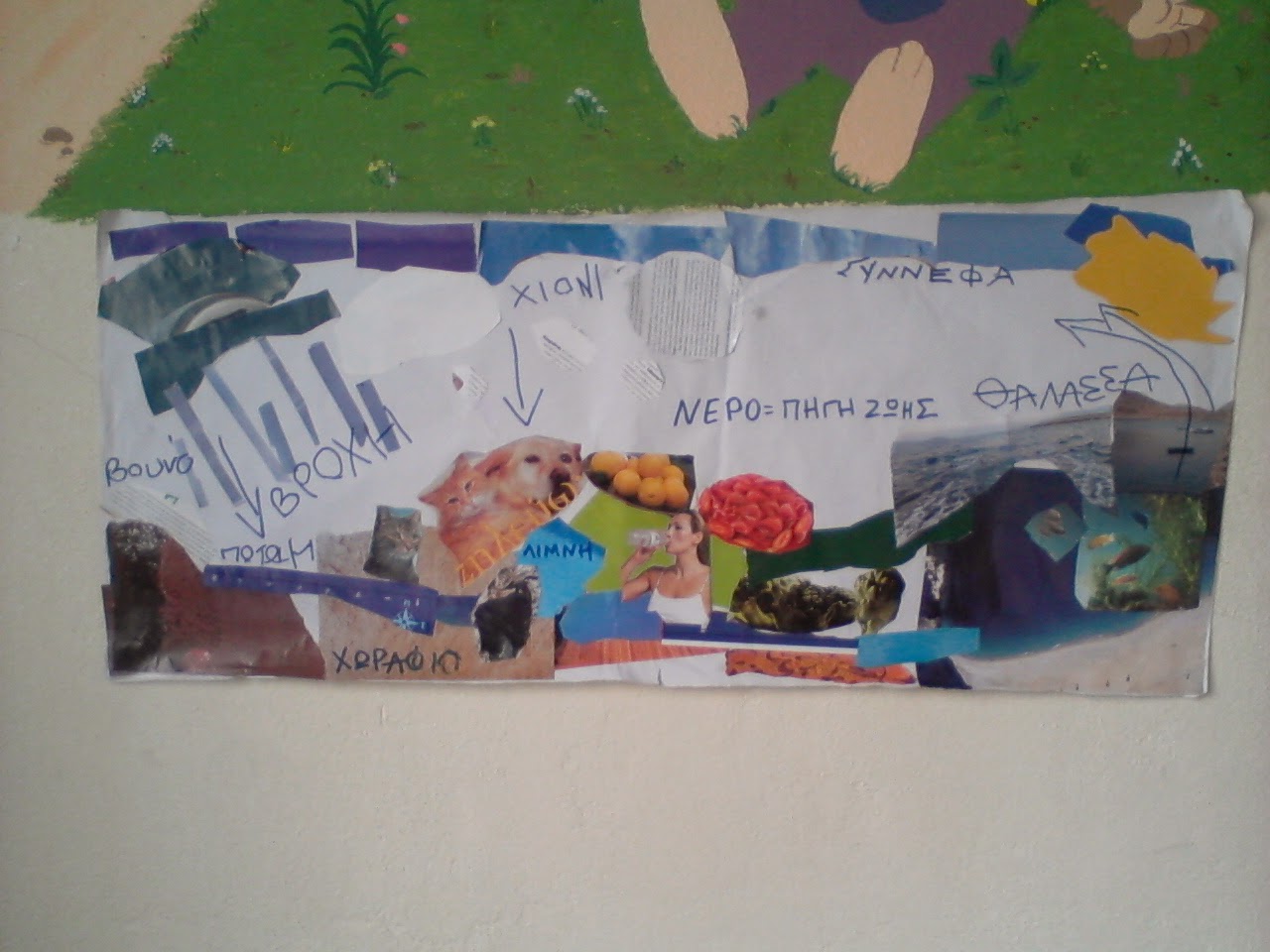 Τελικό στάδιο η κατασκευή της μακέτας για τον κύκλο του νερού και η αξία του στη ζωή μας. Δουλέψαμε ομαδικά, κόψαμε φωτογραφίες από περιοδικά, φανταστήκαμε τι θα κάναμε και ιδού το αποτέλεσμα: