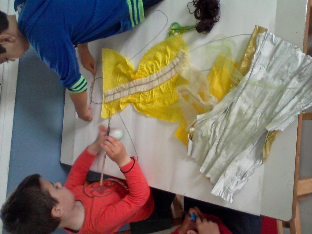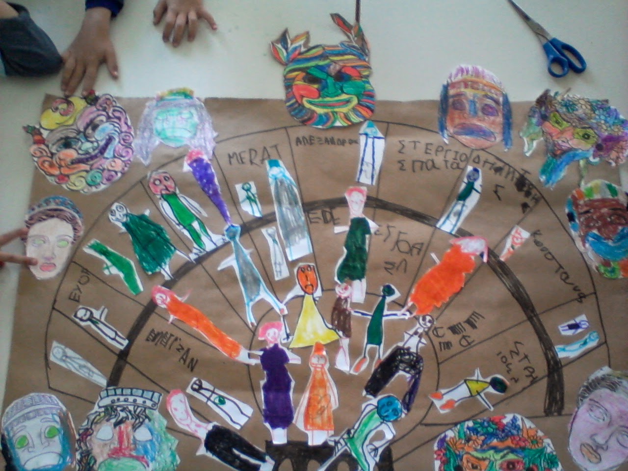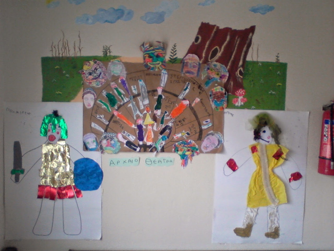 Η πρώτη τους επαφή με τα αρχαία κείμενα ήταν την 28η Οκτωβρίου διαβάζοντας την Ειρήνη της Σ. Ζαραμπούκα. Κατόπιν μάθαμε τι είναι γενικώς το Θέατρο όταν ετοιμαζόμασταν για την Χριστουγεννιάτικη θεατρική παράσταση. Δεν θέλαμε όμως να επεκταθούμε στο σύγχρονο θέατρο που κάποια το γνωρίζουν γιατί έχουν παρακολουθήσει παραστάσεις με τους γονείς τους. Την περίοδο της Αποκριάς οι μάσκες ήταν η επόμενη μεγάλη αφορμή για να συζητήσουμε για τα προσωπεία και την ενδυμασία. Πλέον δε χρησιμοποιούν τη λέξη μάσκα αλλά τη λέξη “προσωπείο”.