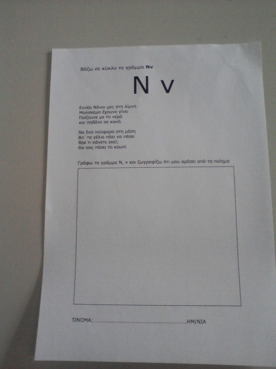 Μαθαίνω το γράμμα Ν του νερού. Στο παρακάτω ποιηματάκι ψάχνουμε να βρούμε το γράμμα Ν, ν να το γράψουμε και να ζωγραφίσουμε κάτι που μας άρεσε: