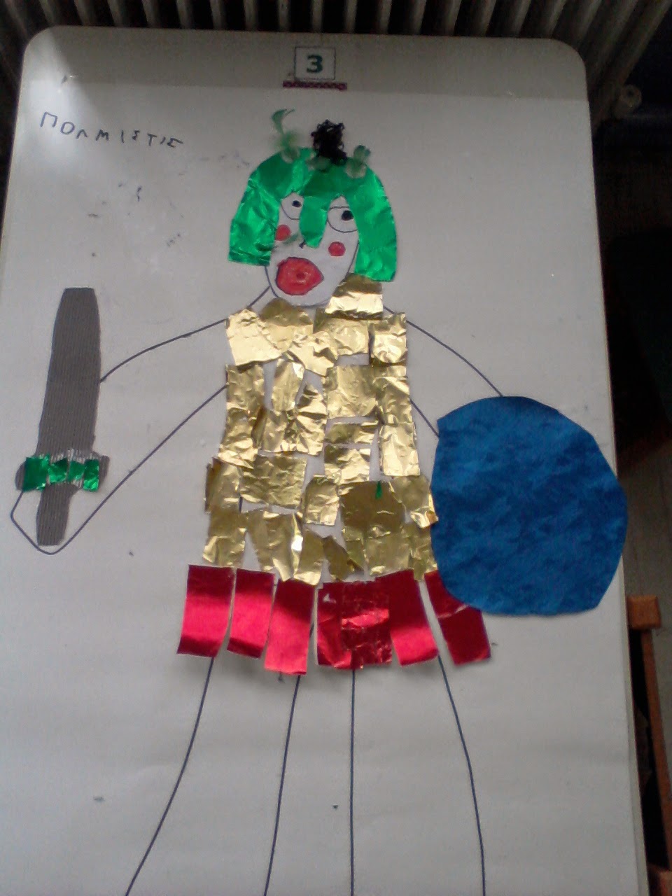 Επόμενο στάδιο οι ηθοποιοί του αρχαίου θεάτρου. Μετά από ψάξιμο στο διαδίκτυο αποφάσισαν να κάνουν έναν πολεμιστή και μια γυναίκα. Φυσικά θα ήταν άνδρας, αλλά θα φορούσε προσωπείο και ρούχα γυναικεία. Χωρίστηκαν σε ομάδες, σκέφτηκαν τα υλικά που θα χρησιμοποιούσαν, μοιράστηκαν τις δουλειές και ξεκίνησαν.