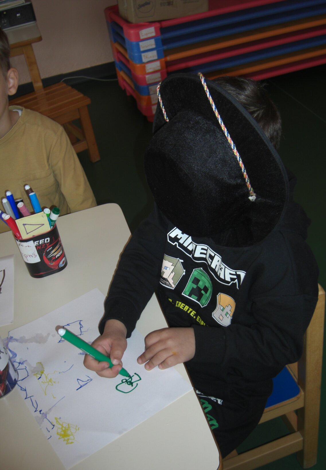Μέσα από τη συζήτηση στην ολομέλεια της τάξης ανιχνεύσαμε τις απόψεις και τις εμπειρίες των παιδιών σχετικά με τη διαφορετικότητα. Παροτρύναμε το καθένα ξεχωριστά να μιλήσει για τον εαυτό του (αφού τον παρατηρήσαμε μέσα στον καθρέφτη), τα εξωτερικά αλλά και τα εσωτερικά του χαρακτηριστικά. Διαπιστώσαμε ότι κανένας μας δεν είναι ίδιος με τον άλλον, αλλά είμαστε όλοι ίσοι και όλοι έχουμε τα ίδια δικαιώματα. Για να το καταλάβουμε καλύτερα και με σκοπό να βελτιώσουμε τις ικανότητές μας στη περιγραφή, παίξαμε το παιχνίδι «Στο κεφάλι μου σε έχω».