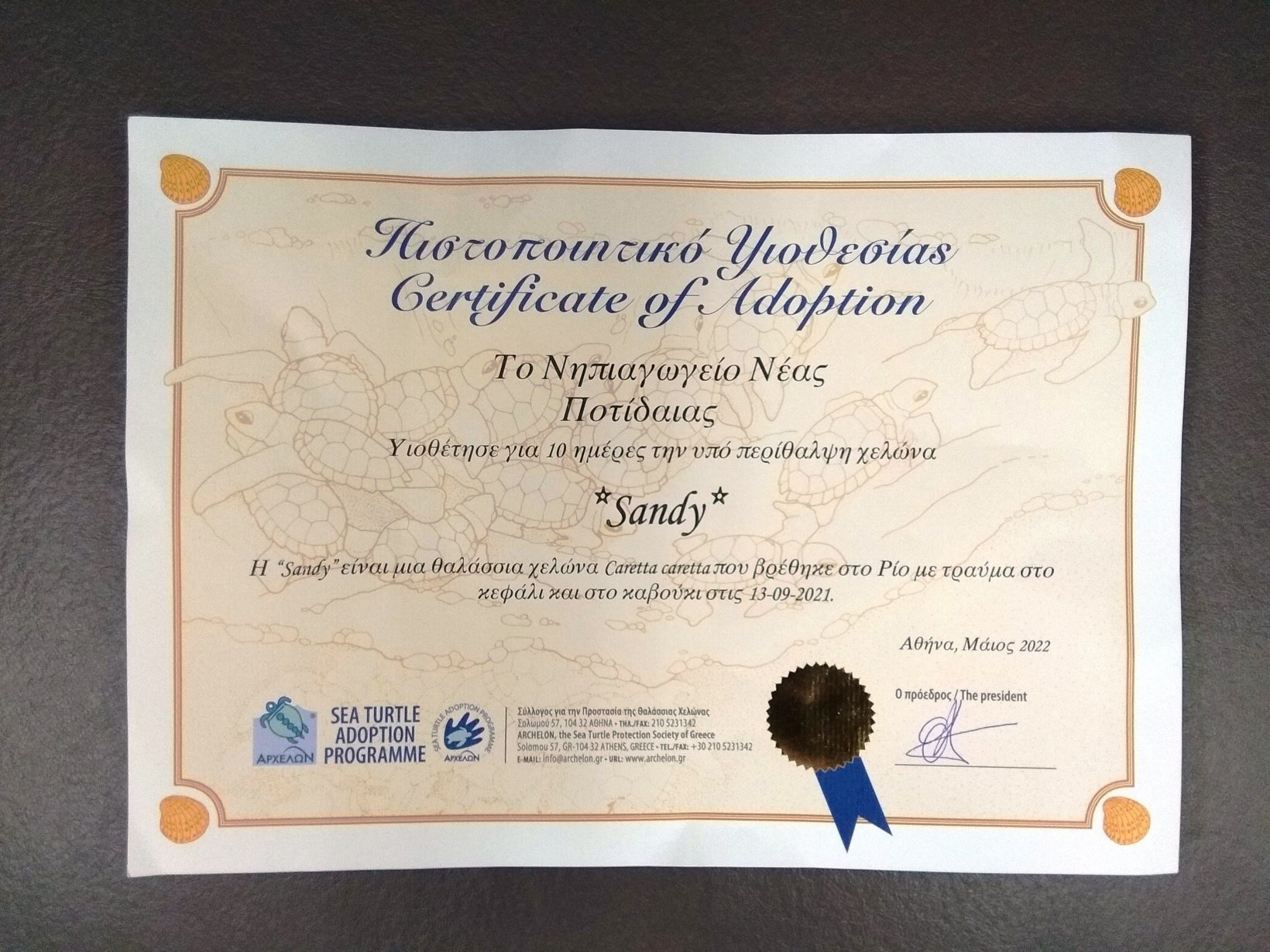 Οι ειδικοί μας ενημέρωσαν για το έργο τους, για τη θαλάσσια χελώνα και τους κινδύνους που αντιμετωπίζει μέσα στην θάλασσα. Είδαμε μερικές τραυματισμένες χελώνες και αποφασίσουμε να συνδράμουμε και μεις λίγο στην ανάρρωση τους και την επιστροφή τους στην θάλασσα, υιοθετώντας μια. Την ΣΑΝΤΥ. Ο σύλλογος ΑΡΧΕΛΩΝ μας έστειλε το πιστοποιητικό υιοθεσίας και ένα βίντεο για να δούμε την ΣΑΝΤΥ