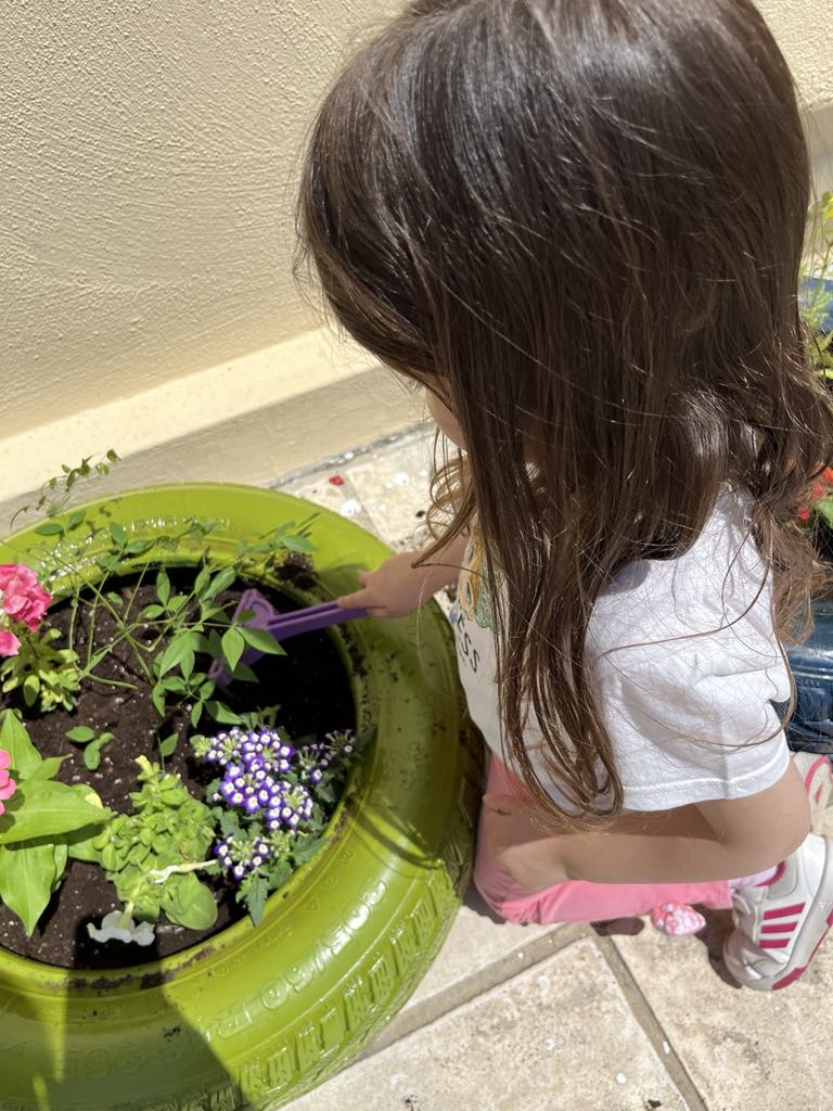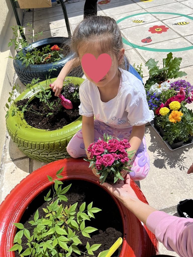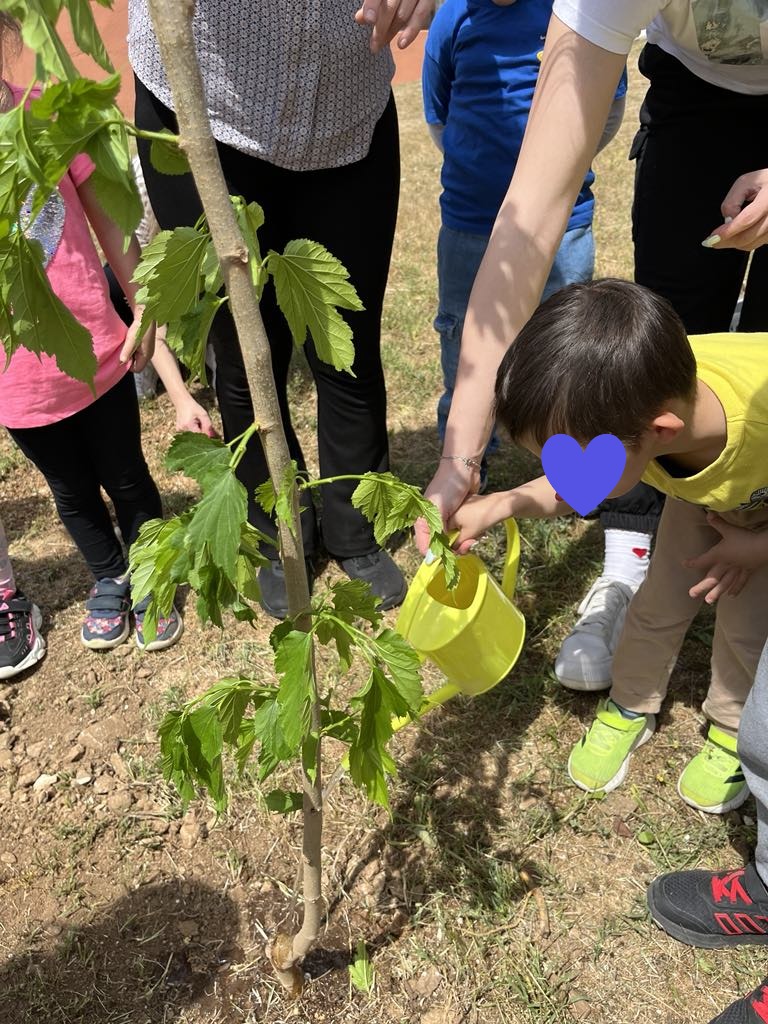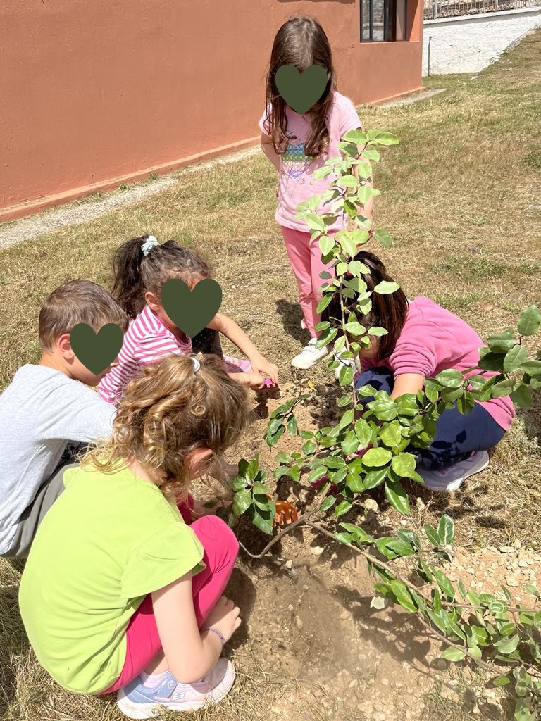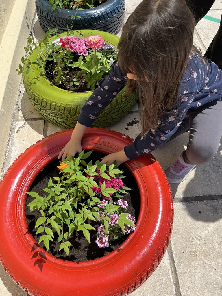 η δημιουργία παρτεριών και γλαστρών από ανακυκλώσιμα υλικά (τενεκέδες, λάστιχα αυτοκινήτων) και η εμπλοκή των παιδιών στη διαδικασία φύτευσης και φροντίδας των φυτών.