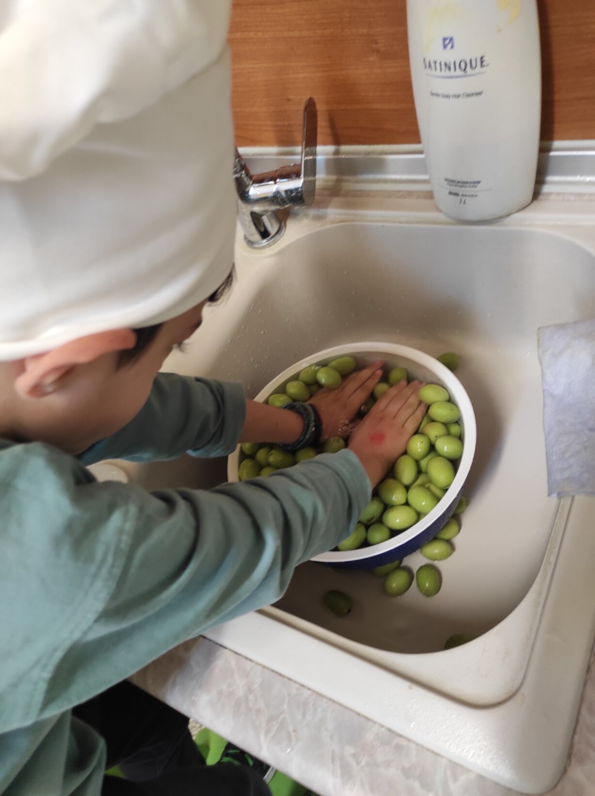 Στη συνέχεια, πιάσαμε δουλειά! Πλύναμε τις ελιές μας καλά και τις χαράξαμε προσεκτικά με ένα ειδικό εργαλείο για να μπορέσουν να ξεπικρίσουν. Αφού τις τοποθετήσαμε σε δοχεία με νερό, μάθαμε πως χρειάζεται να αλλάζουμε το νερό καθημερινά για περίπου 10 μέρες. Έτσι, παρακολουθήσαμε με ενθουσιασμό τη διαδικασία, καθώς τις δοκιμάζαμε για να δούμε εάν έχουν ξεπικρίσει!