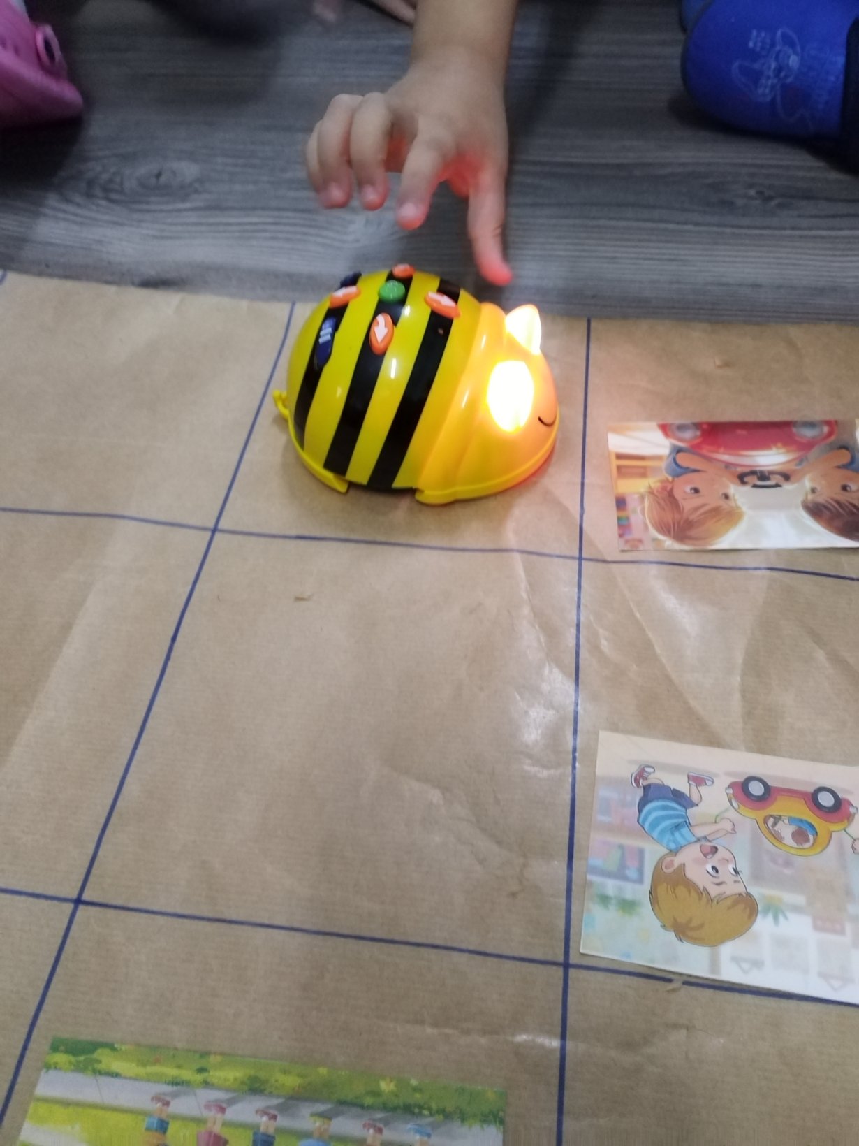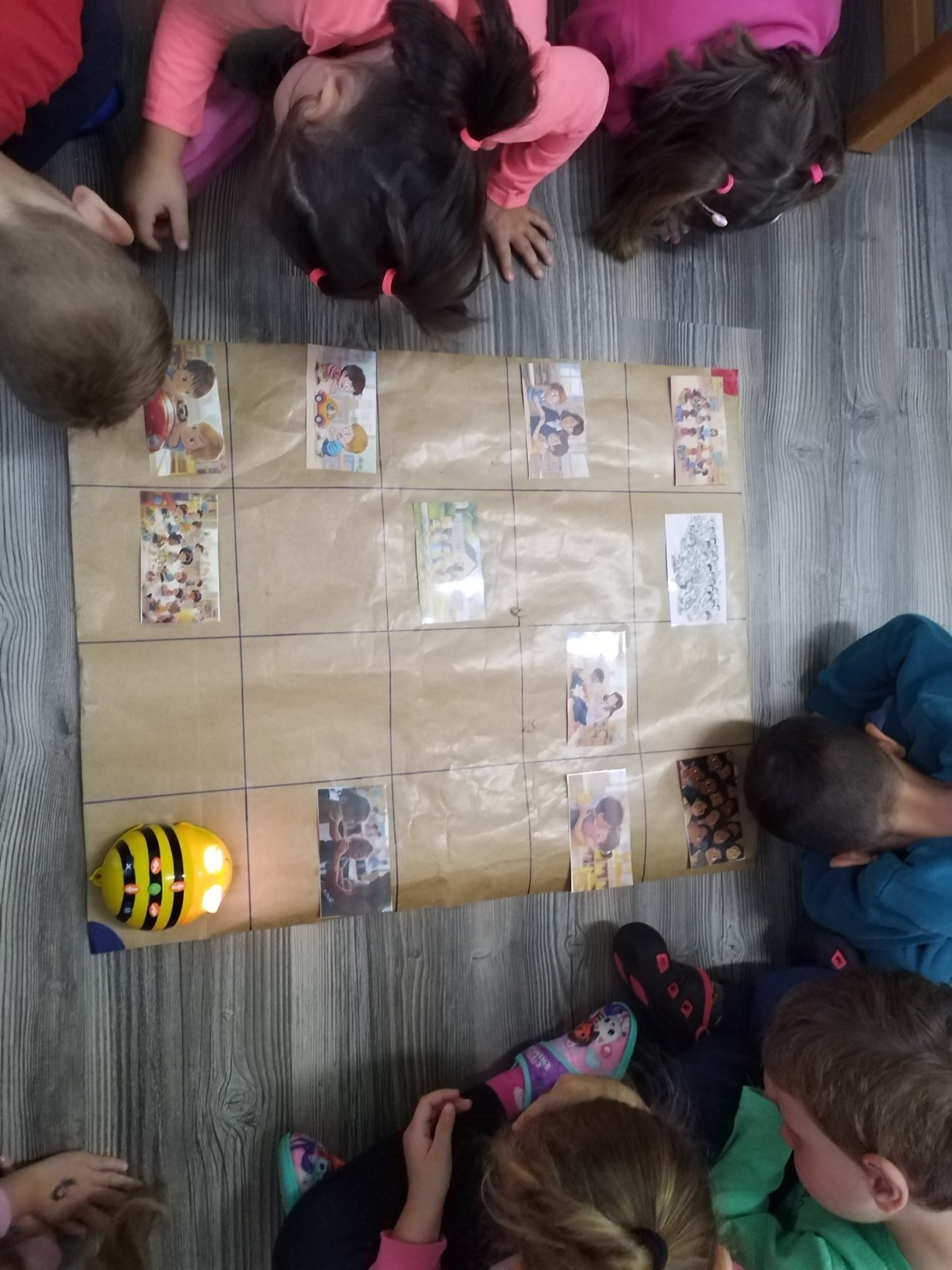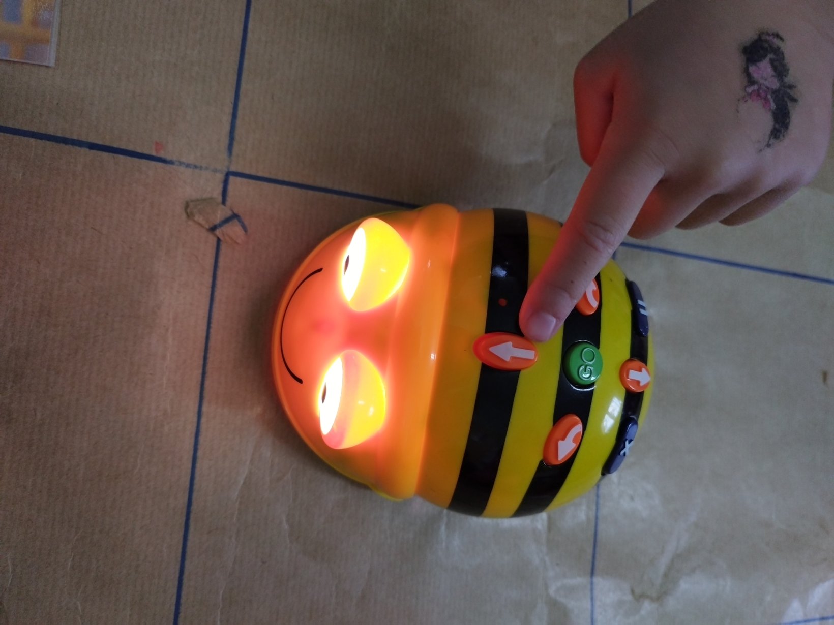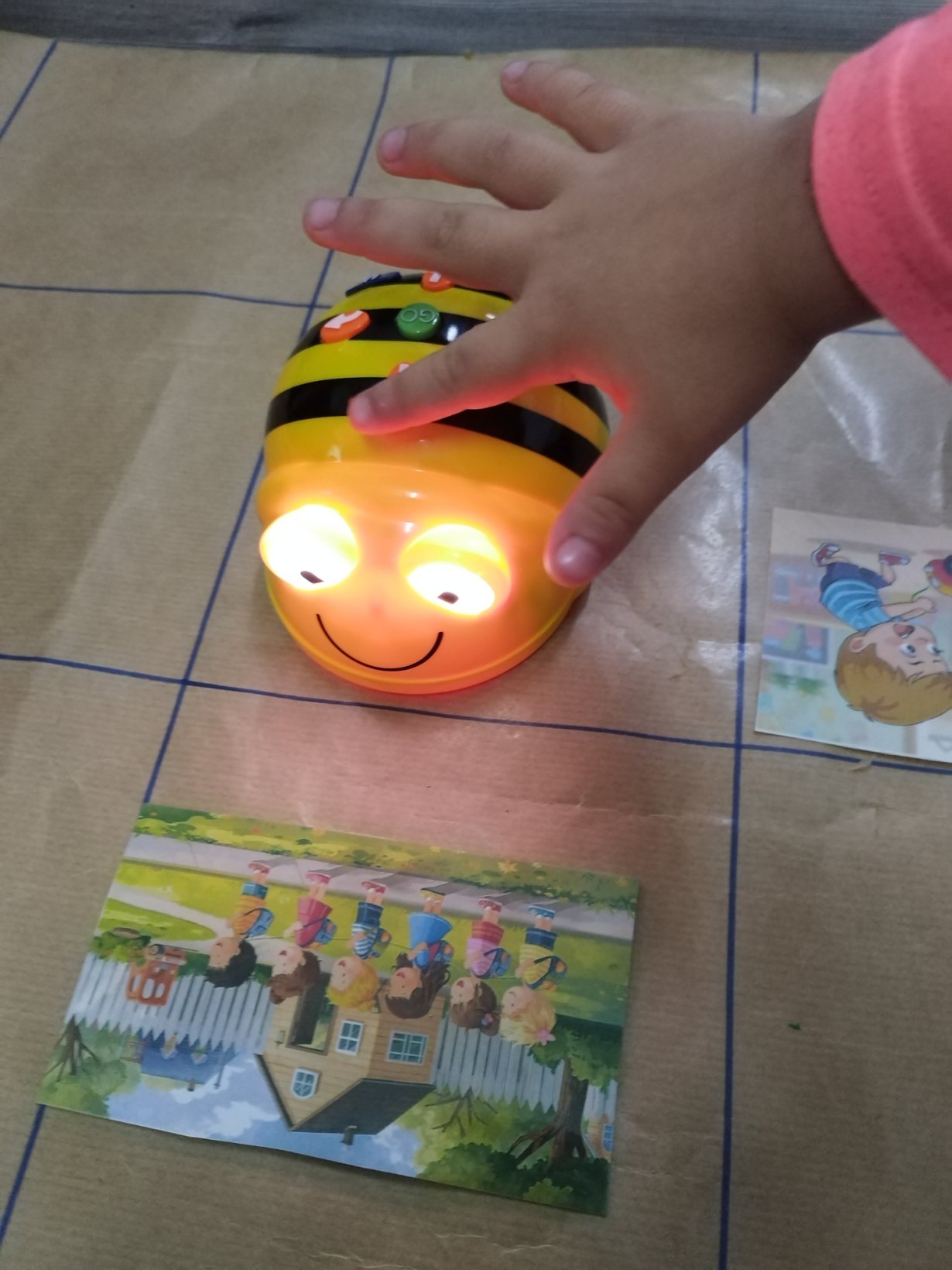Αρχικά παρουσιάζουμε την ρομποτική μέλισσα (bee bot) στα παιδιά και τις δυνατότητες που έχει να κινείται (μπροστά πίσω δεξιά αριστερά). Δίνουμε αρχικά τυχαίες οδηγίες στην ρομποτική μέλισσα για να καταλάβουμε τις κινήσεις της.