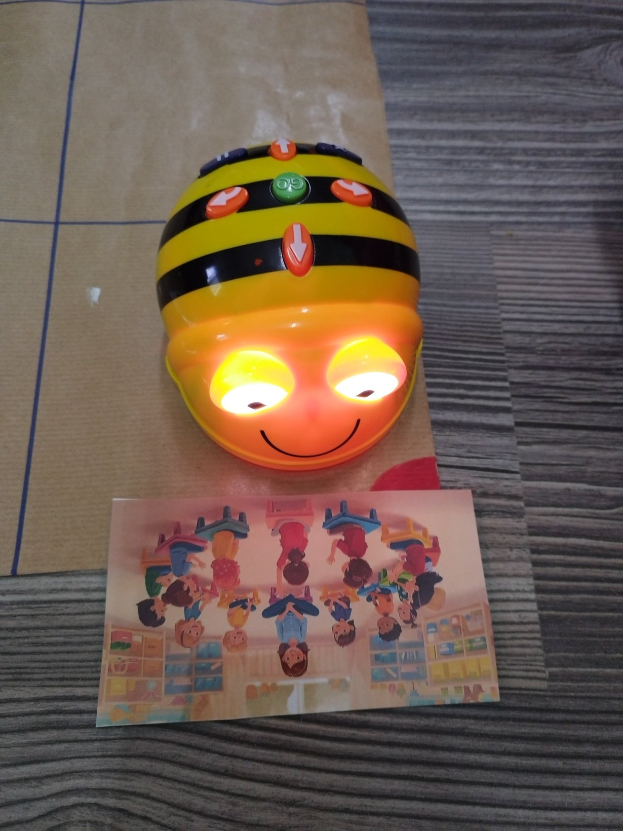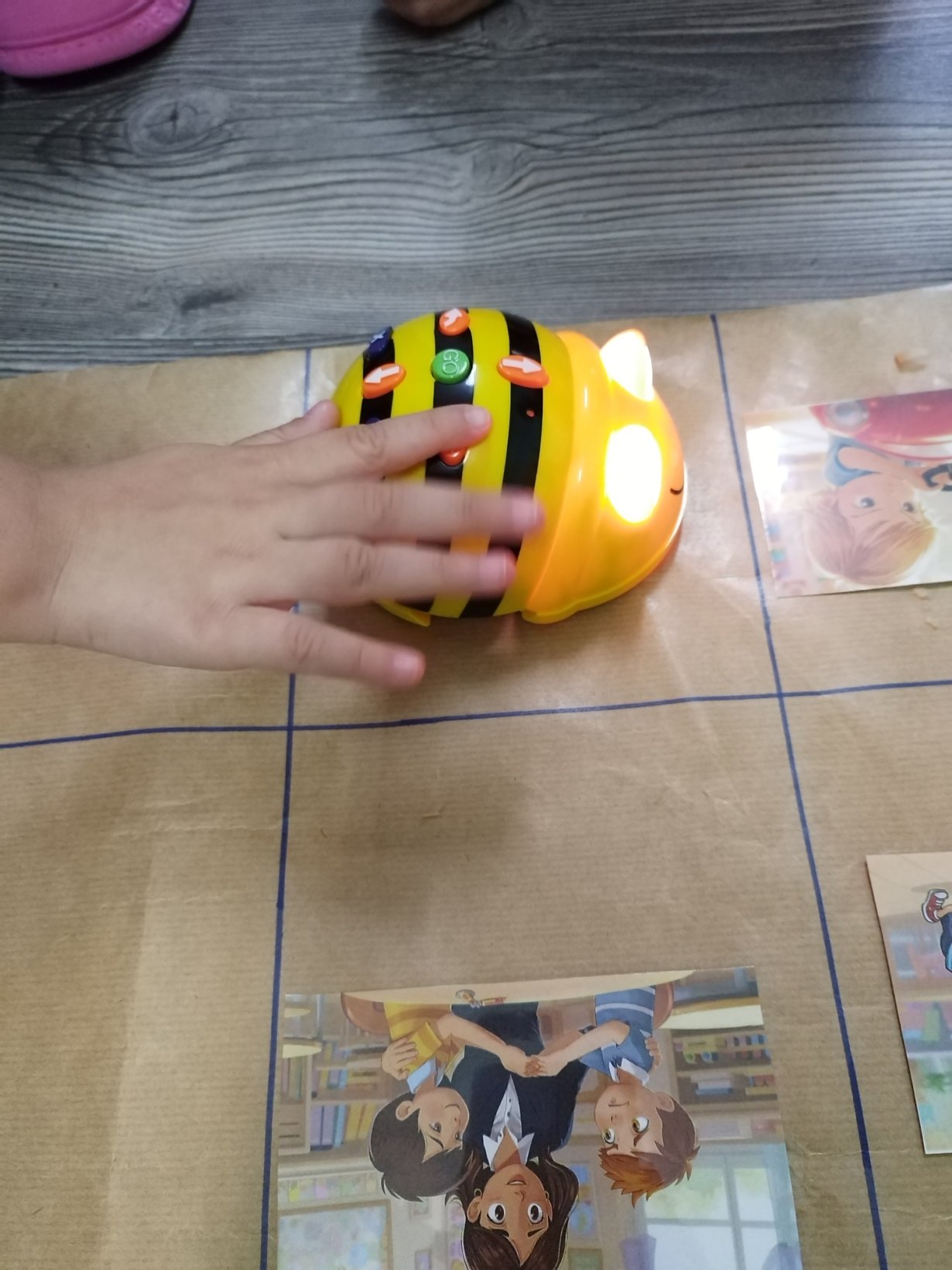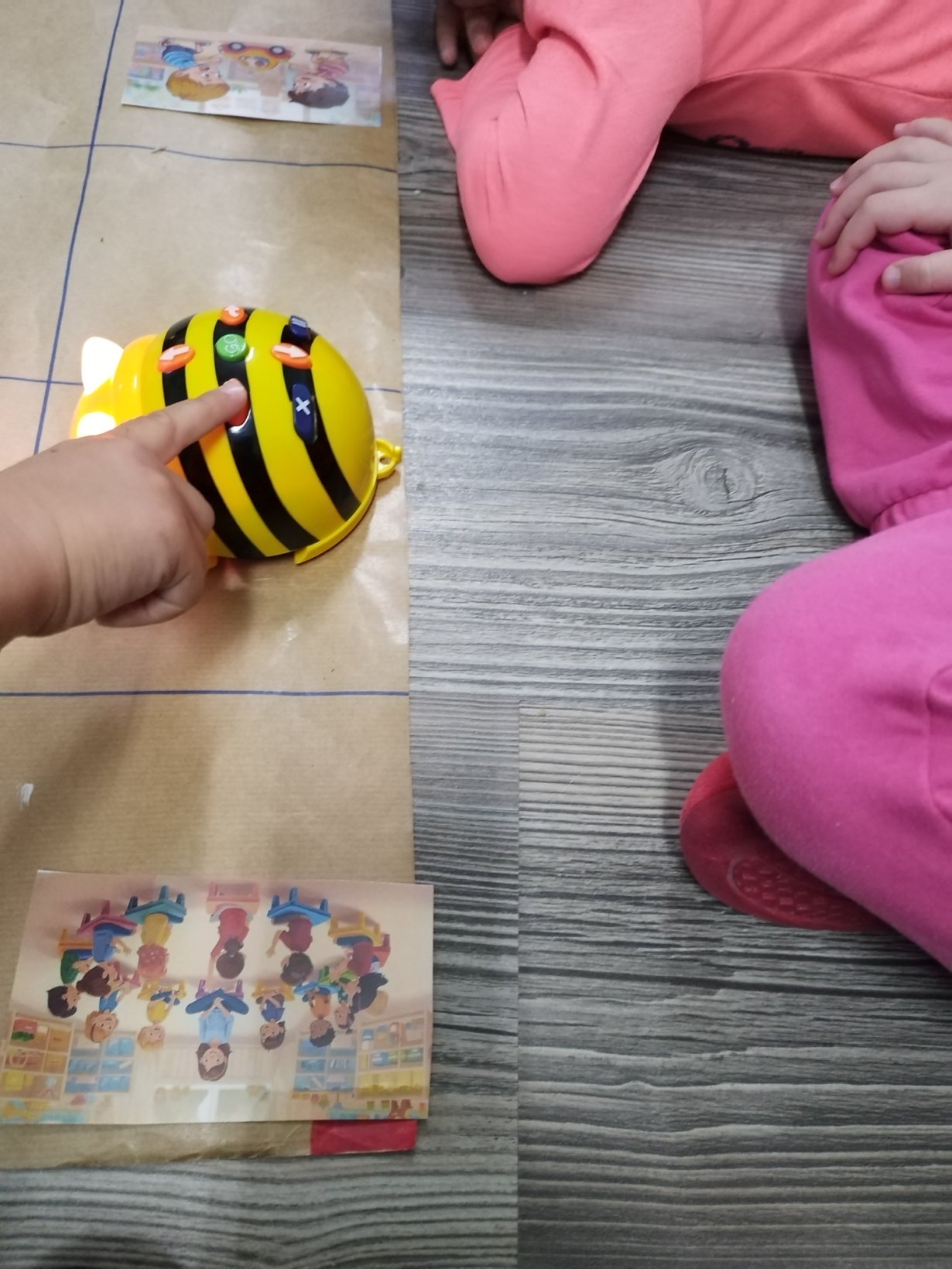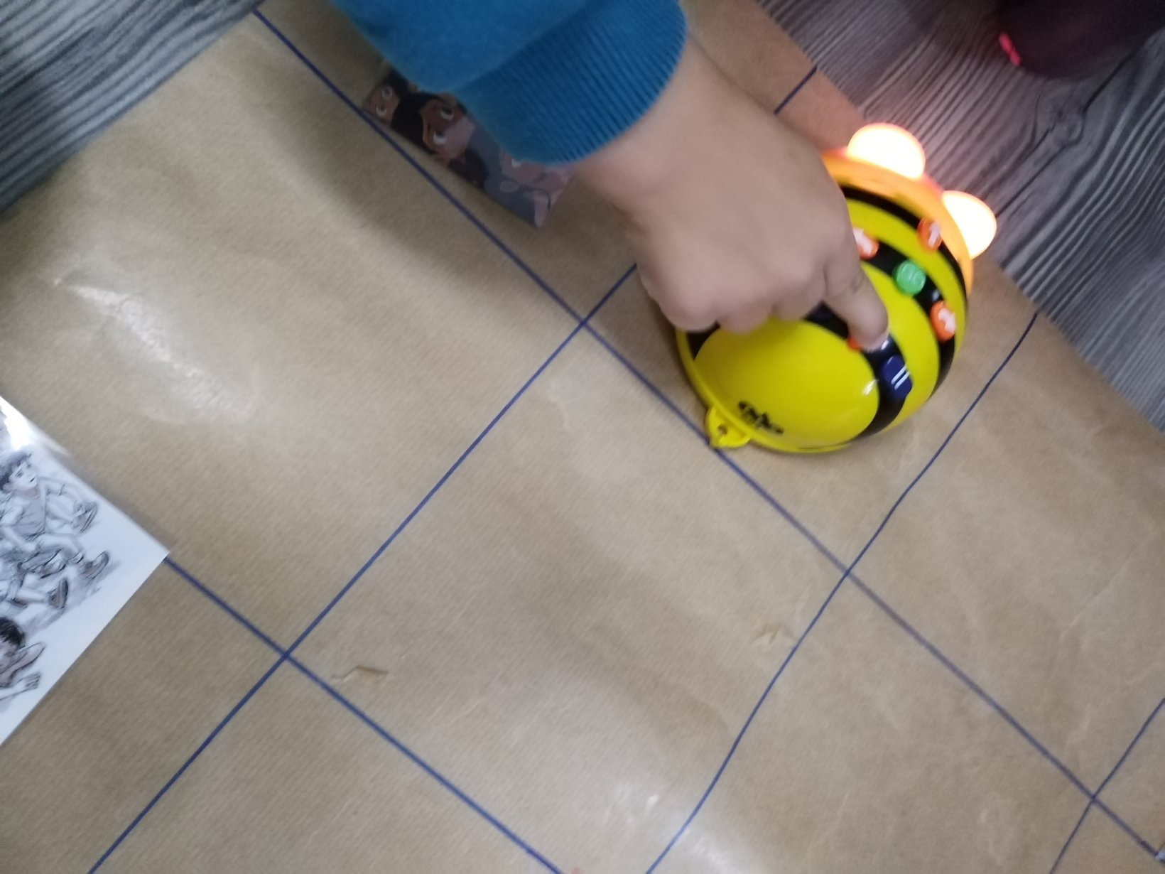 Αρχικά παρουσιάζουμε την ρομποτική μέλισσα (bee bot) στα παιδιά και τις δυνατότητες που έχει να κινείται (μπροστά πίσω δεξιά αριστερά). Δίνουμε αρχικά τυχαίες οδηγίες στην ρομποτική μέλισσα για να καταλάβουμε τις κινήσεις της.