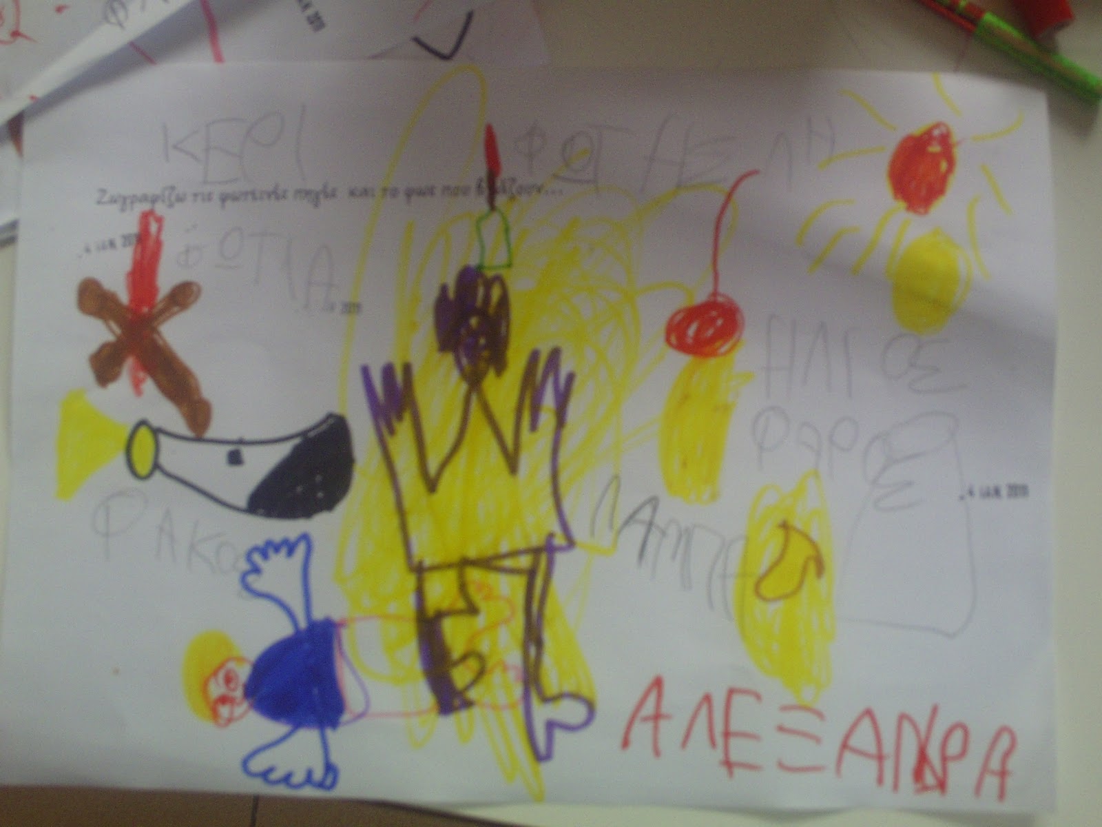 Αφήνουμε τα παιδιά να παρατηρήσουν την παραπάνω εικόνα των δυο αδελφών, του Φώτη και του Σκοτάδη. Ο Σκοτάδης ζει σε μέρη σκοτεινά και κυρίως τη νύχτα. Εκεί είναι το σπίτι του εκεί και οι φίλοι του. Ο Σκοτάδης είναι ο αδερφός τoυ Φώτη που χαρίζει το φως στον κόσμο. Ο Φώτης όπου πηγαίνει μοιράζει φως. Φίλοι του είναι ο Ήλιος, η Αστραπή ο φακός και άλλοι πολλοί. Όταν κρύβεται ο Φώτης, αναλαμβάνει ο αδερφός του ο Σκοτάδης.