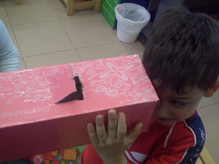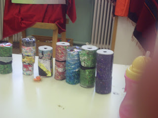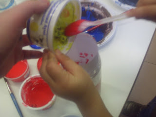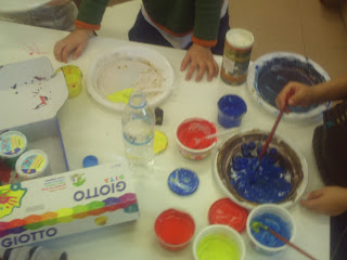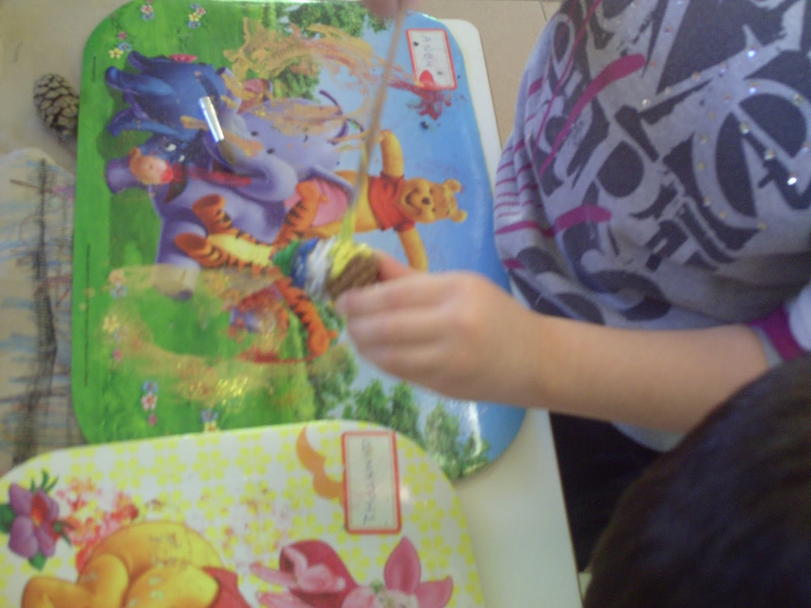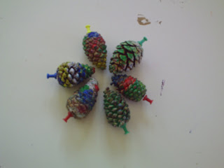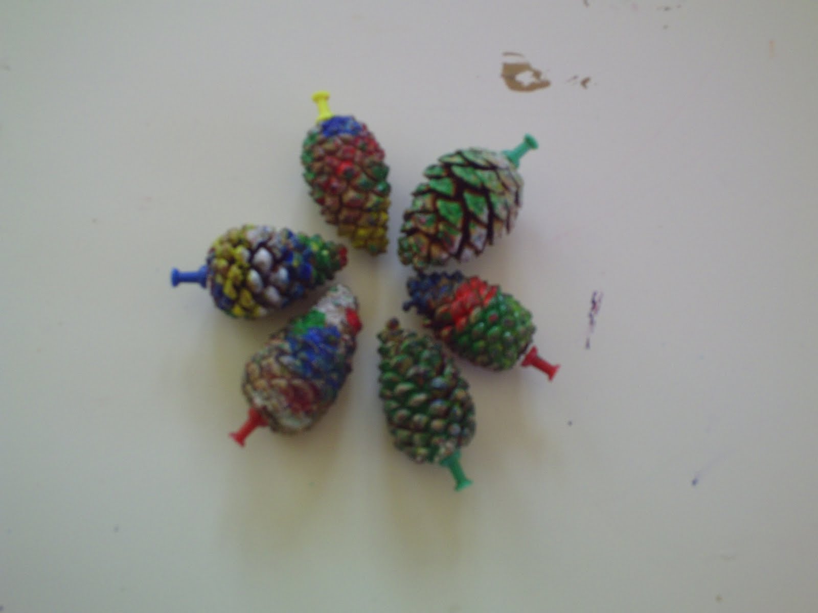 Επίσης, από την προηγούμενη εβδομάδα πήγα στο νηπιαγωγείο 2 σβούρες, που ξετρέλλαναν τα παιδιά και μου ζήτησαν να φτιάξουμε κι άλλες. Έτσι, σήμερα αφού βρήκαμε κλειστές κουκουνάρες, τις βάψαμε, και αφού στέγνωσαν αρχίσαμε την εξάσκηση.