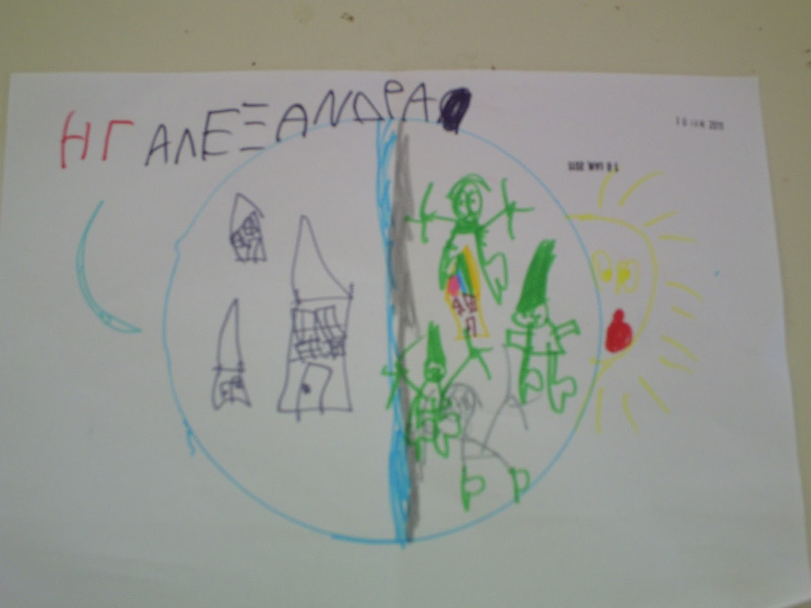 Τους ρωτούμε μετά αναλύοντας το σχέδιό τους τι σχήμα έχει η γη, αν έχουν ζωγραφίσει μέρα ή νύχτα κι από που φαίνεται αυτό.