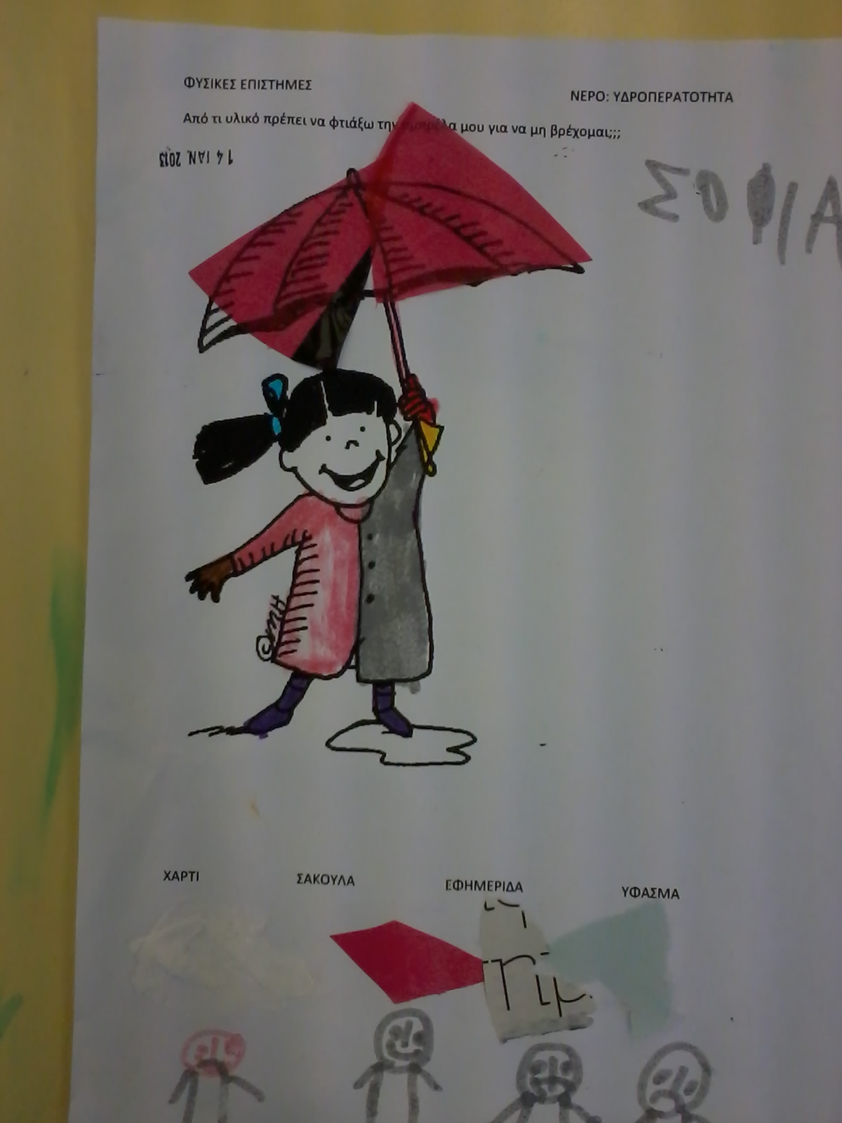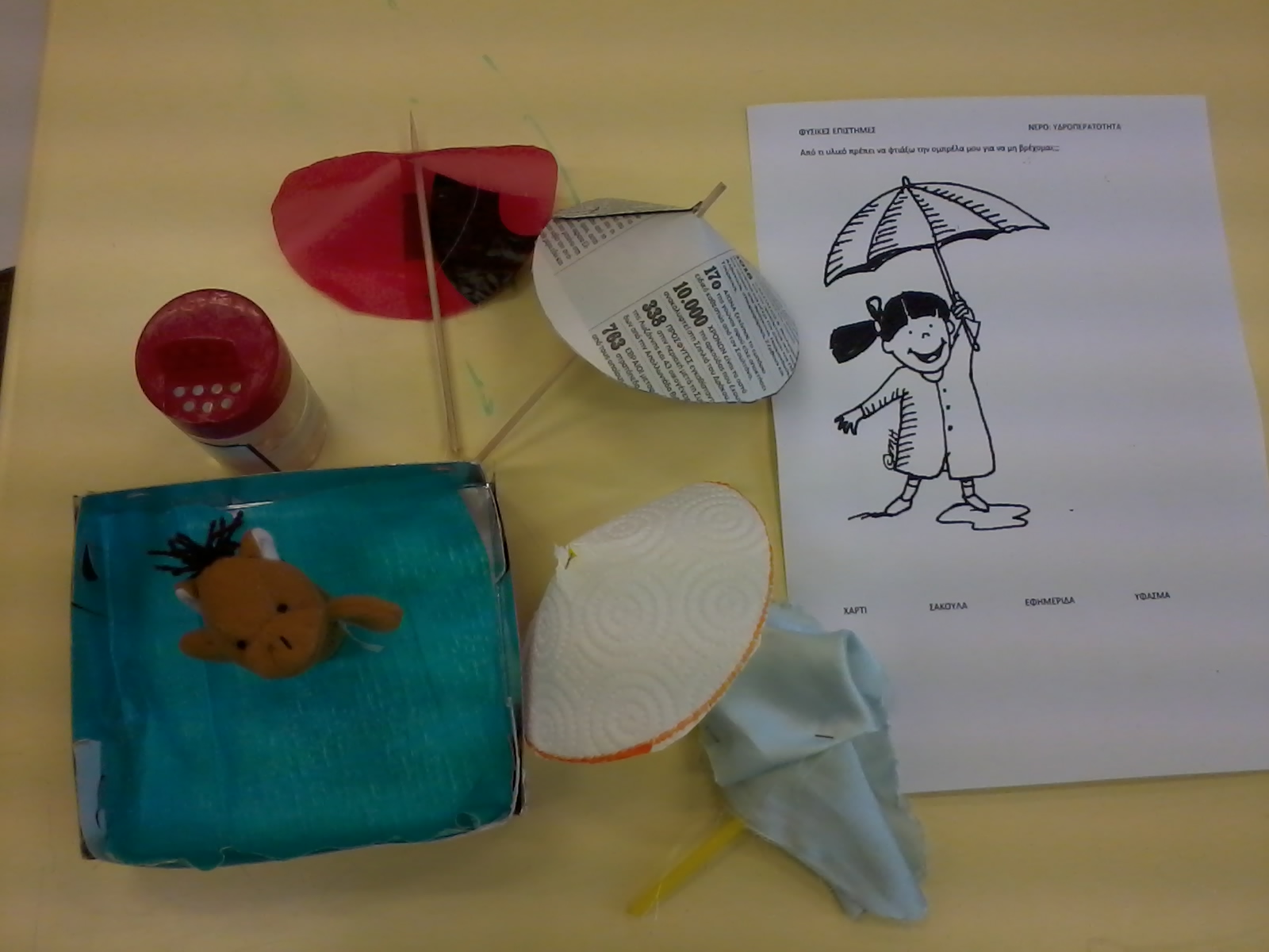 Τα παιδιά σημειώνουν ποια υλικά διαπερνά το νερό και ποια όχι, και επιλέγουν με ποιο υλικό πρέπει να φτιαχτεί η ομπρέλα.
