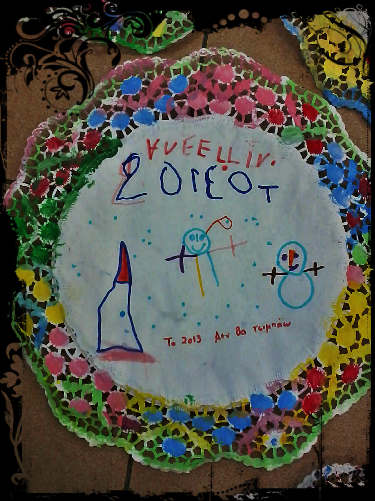 Χρησιμοποιήσαμε βάσεις τούρτας, όπου βάψαμε με πινέλα τη μπορντούρα, και μέσα ζωγραφίσαμε την πρώτη ζωγραφιά του 2013.
