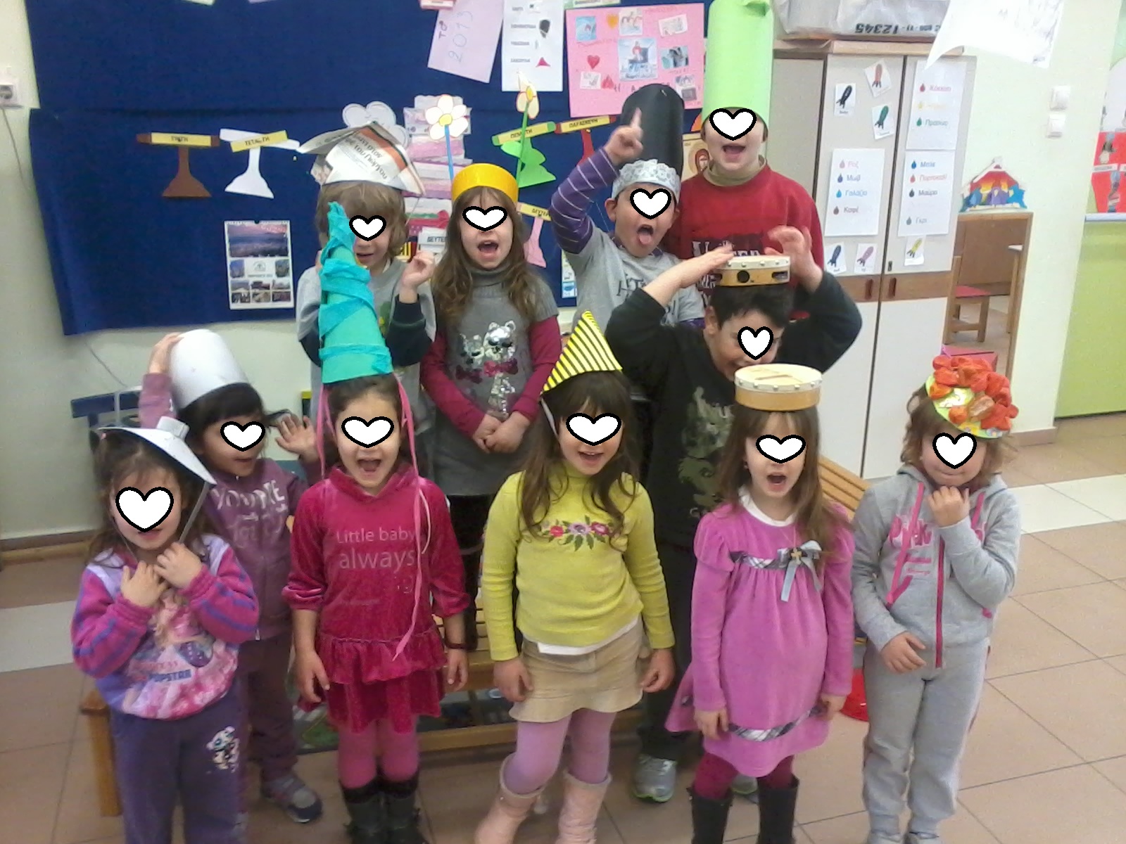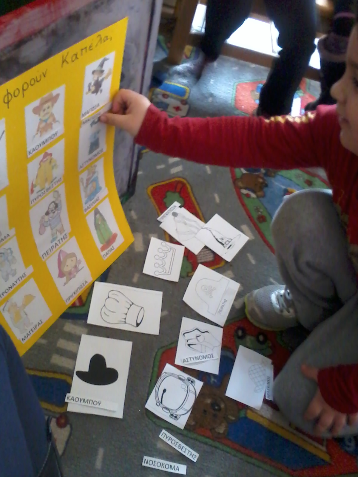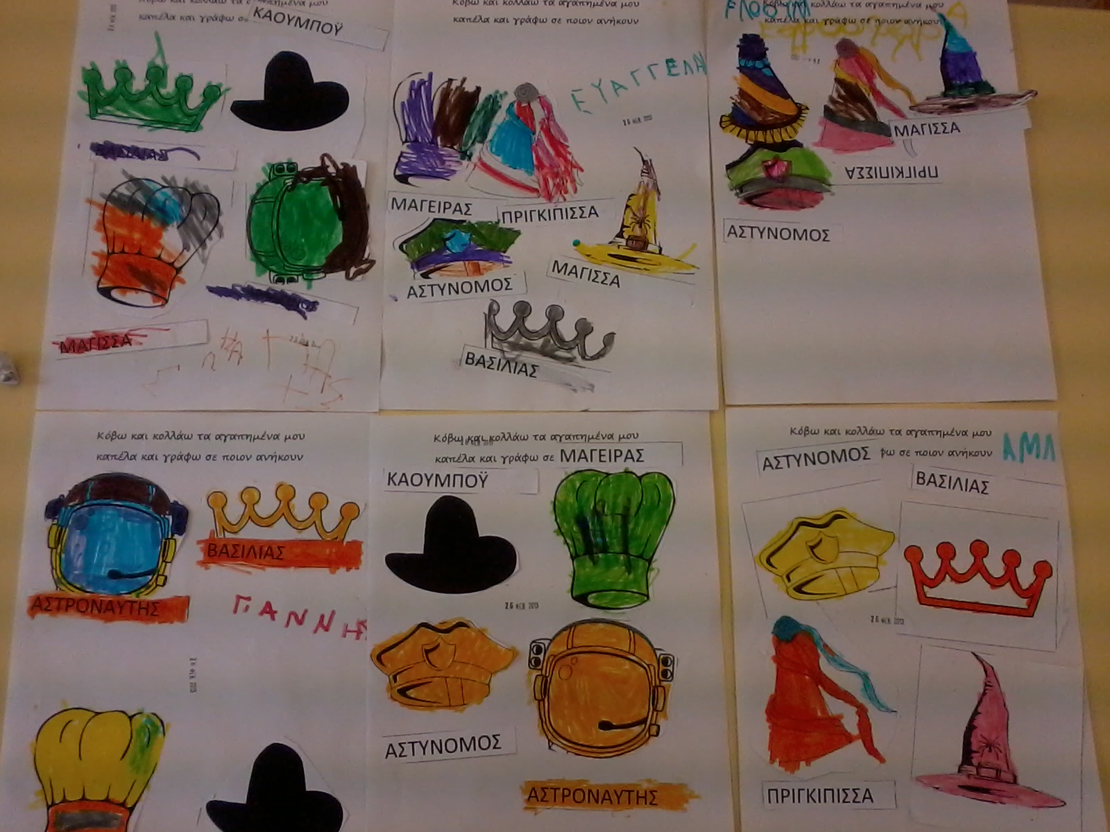 Τα παιδιά τα είπαν όλα (γιατρός, αστυνόμος, παπάς, πυροσβέστης, χιονάνθρωπος, κυνηγός, στρατιώτης, μάγειρας, Άη Βασίλης, μάγισσα, καουμπόυ, κλόουν κλπ), καπέλα λόγω επαγγέλματος, καπέλα για προστασία, καπέλα στολής, και μερικά απρόσμενα, όπως το “καπέλο” του Αγίου Δημητρίου (φωτοστέφανο). Τώρα έχουμε άφθονο υλικό για συζήτηση και μεταμφιέσεις τις ημέρες που έρχονται.