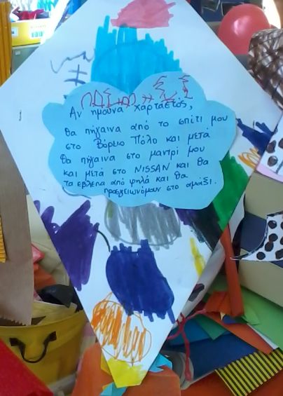 Τα παιδιά υπαγορεύουν αυτό που φαντάζονται και το κολλούν στο χαρταετό τους. Στη συνέχεια πετάμε τους χαρταετούς με τις ευχές μας ψηλά στον ουρανό…
