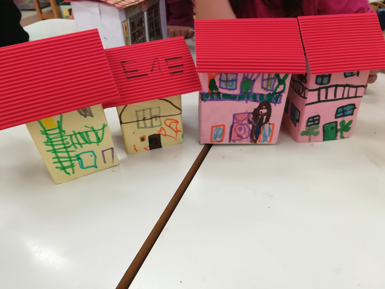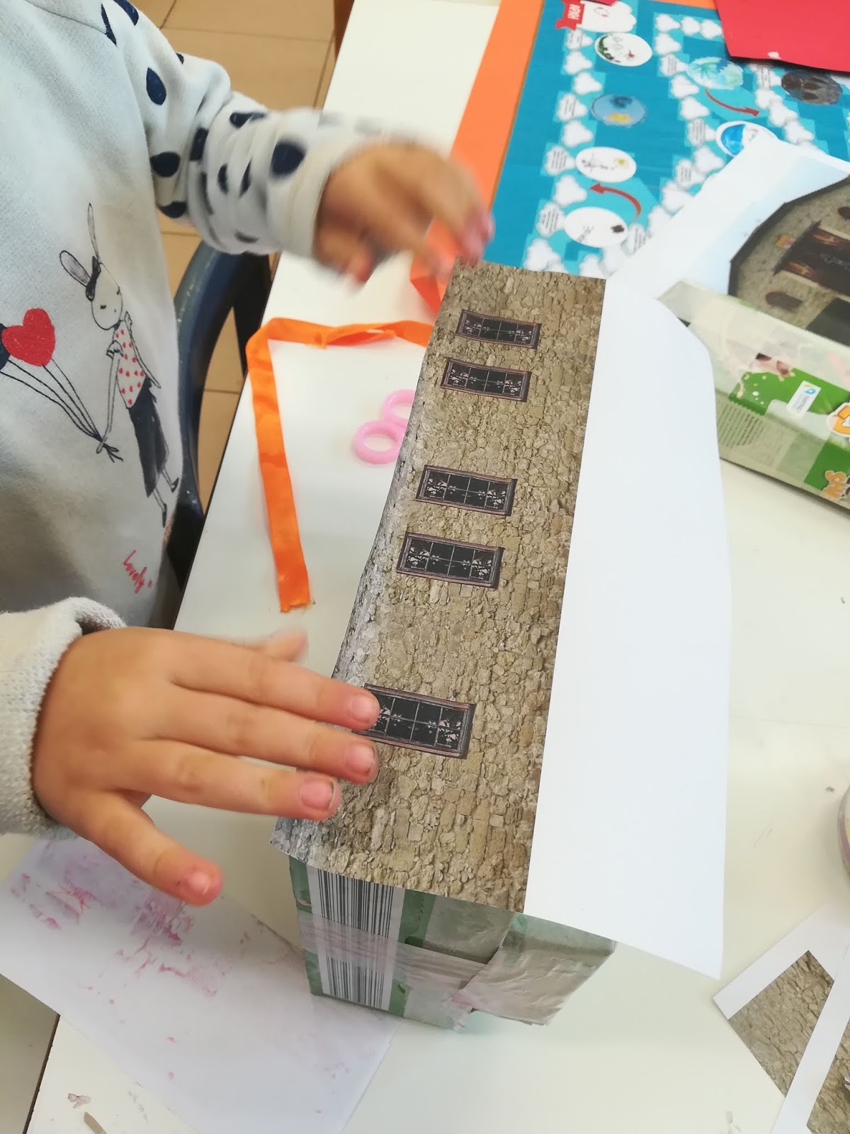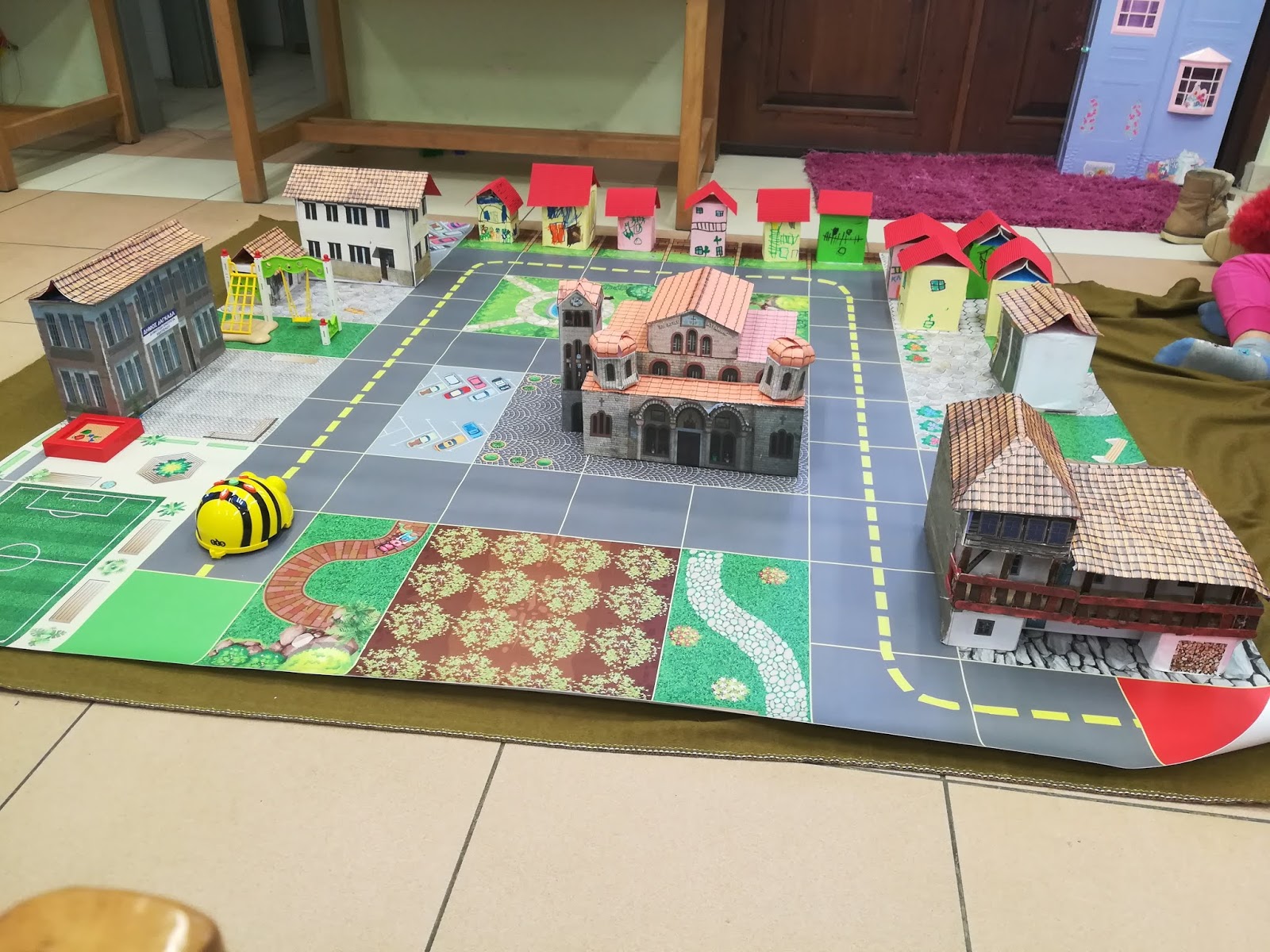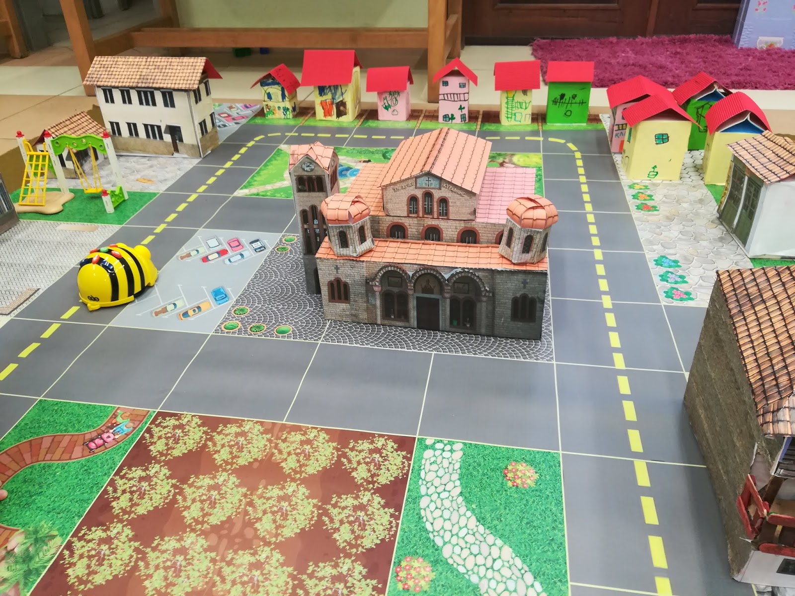 Αποφασίσαμε να χρησιμοποιήσουμε τις φωτογραφίες μας για να παρουσιάσουμε το χωριό μας με τη βοήθεια του Beebot. Για το λόγο αυτό επιστρατεύσαμε τους γονείς και με πολύ απλά ανακυκλώσιμα υλικά και συγκεκριμένα άδεια κουτιά συσκευασίας, δημιουργήσαμε μικρά κομψοτεχνήματα.