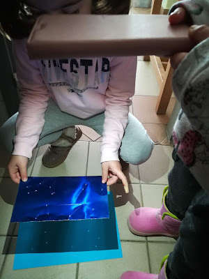 Φτιάξαμε τον δικό μας αυτοσχέδιο ουρανό και κάναμε πειράματα με το φακό (το είδαμε από τις συνεργάτιδές μας στην Κέρκυρα, Ηρώ Παπαδοπούλου και Ελένη Γουναροπούλου ή αλλιώς meleniro). Είδαμε έτσι πώς λάμπουν τα αστέρια στο νυχτερινό ουρανό.