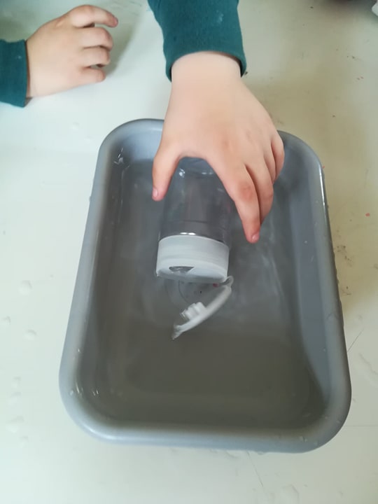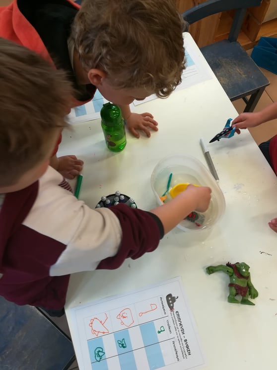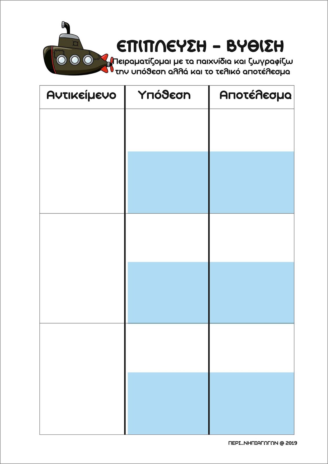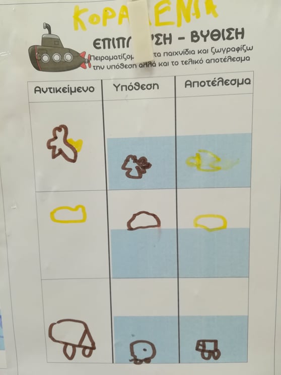 - Ζητήσαμε από τα παιδιά να πειραματιστούν στο σπίτι και να φέρουν ένα παιχνίδι που επιπλέει κι ένα που βυθίζεται. Την επόμενη ημέρα, σε ομάδες τα παιδιά αντάλλαξαν παιχνίδια, και με τη βοήθεια του φύλλου καταγραφής έκαναν υποθέσεις για τα αντικείμενα που επέλεγαν, πειραματίζονταν και τέλος κατέγραφαν το αποτέλεσμα.