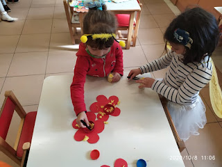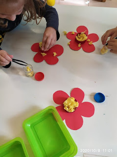 Τα νήπια με το τσιμπιδάκι παίρνουν ένα ένα τα μπαλάκια της γύρης και τα τοποθετούν στο δοχείο τους.