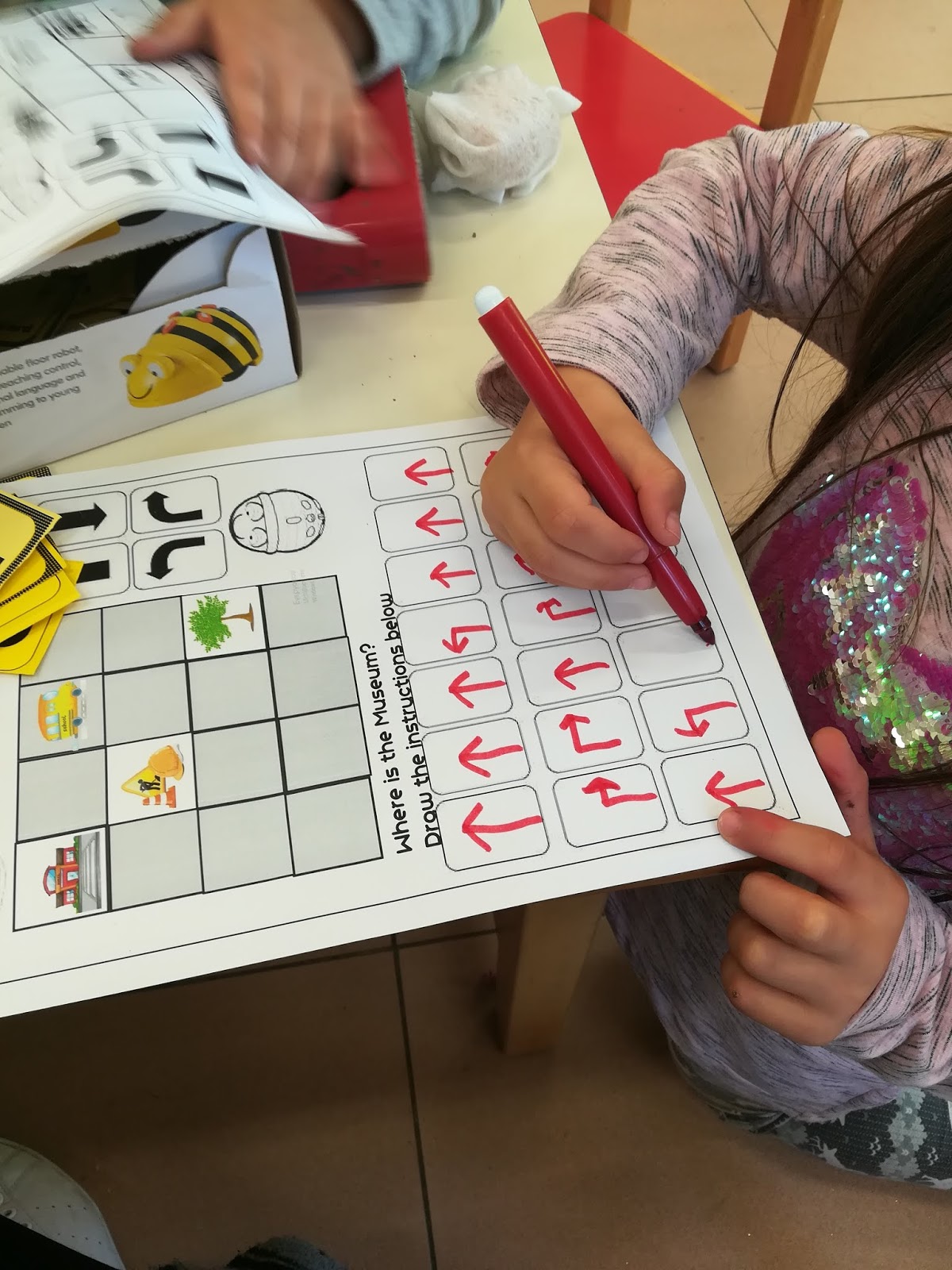 Το κάθε παιδί επιλέγει έναν στόχο και προγραμματίζει το ρομποτακι ώστε να φτάσει στο συγκεκριμένο σημείο. Τέλος πρέπει να τοποθετήσει εκεί τη σημαία και να περιγράψει το στόχο με βάση το σύμβολο που βλέπει.