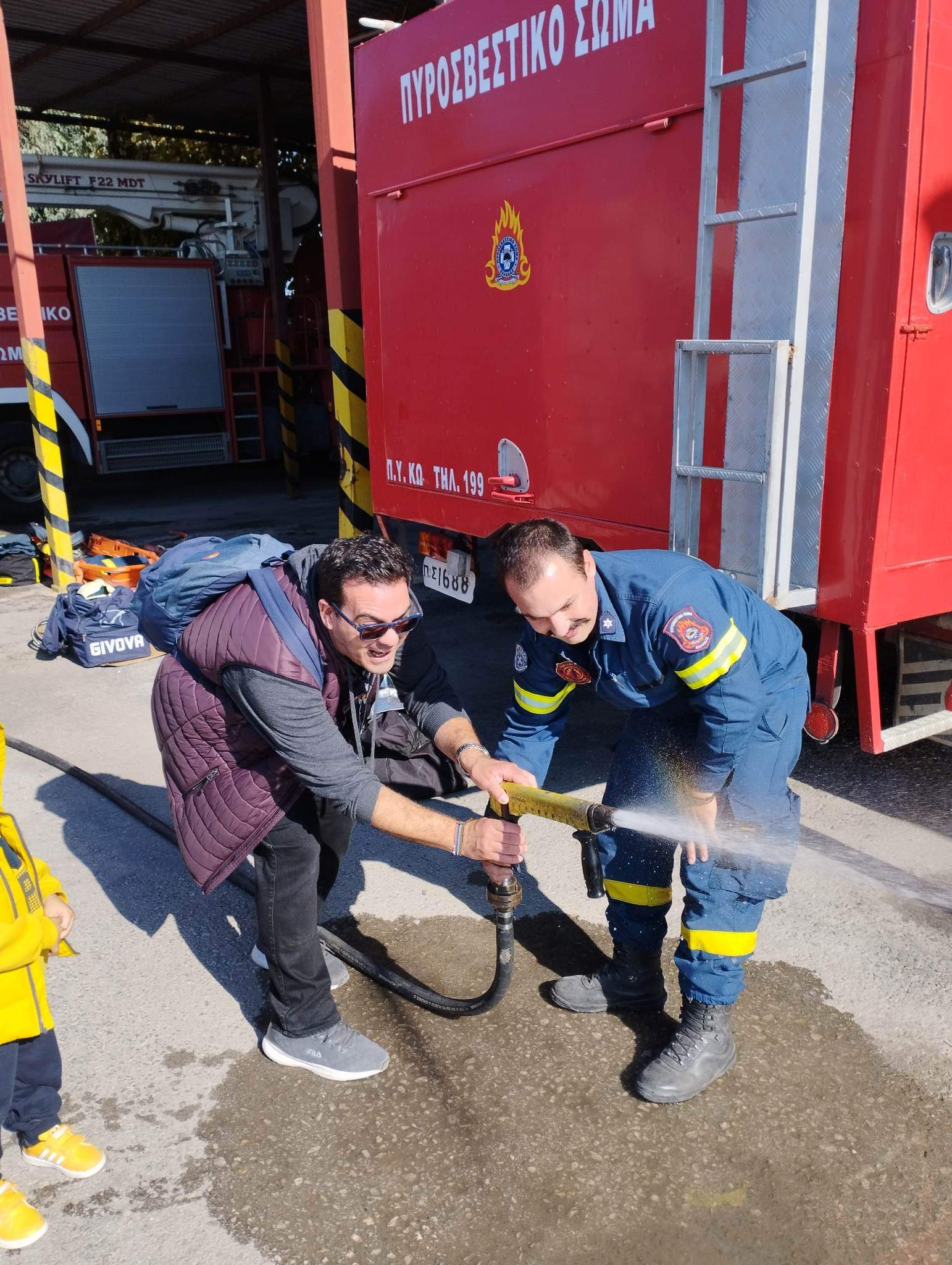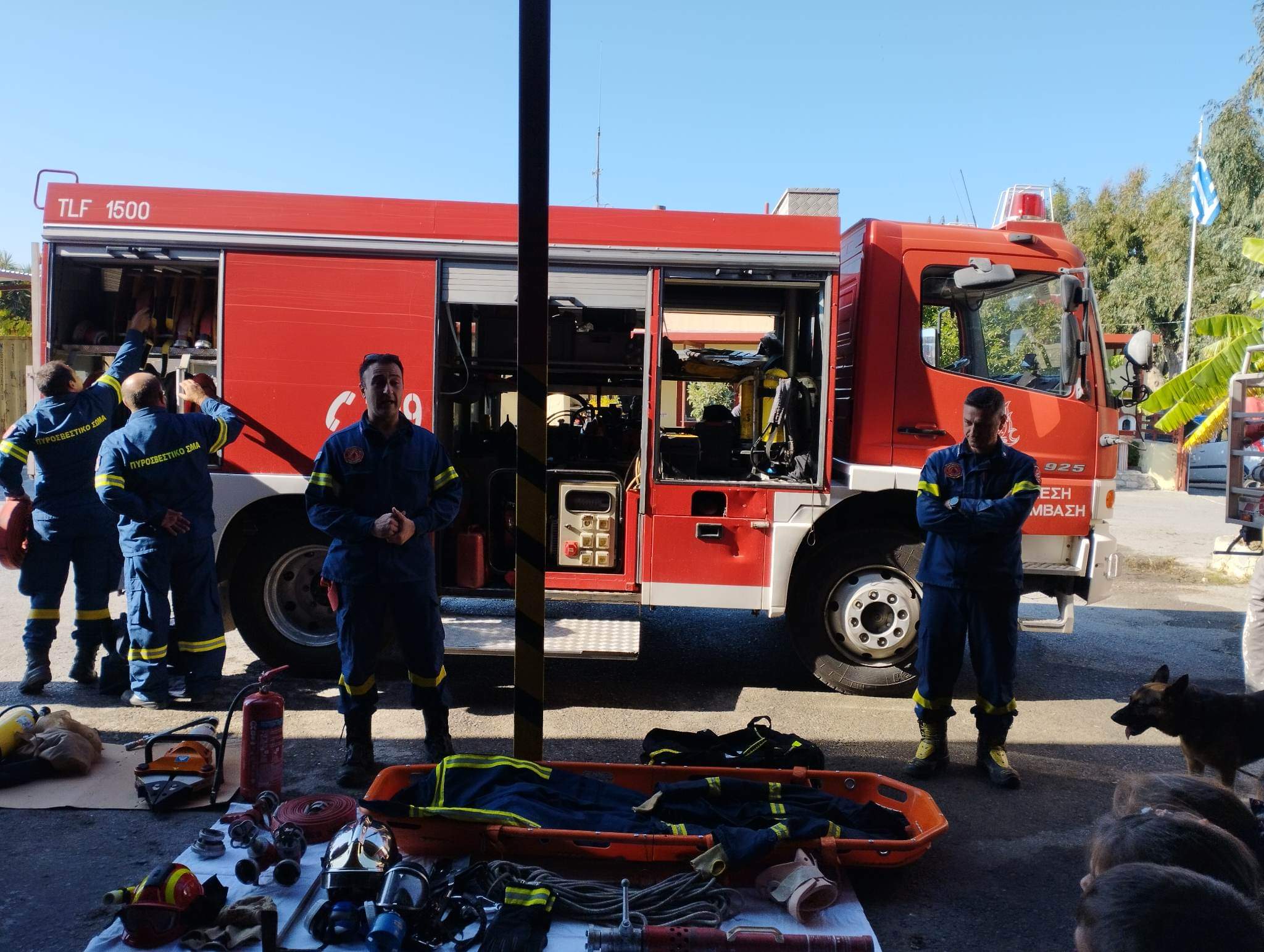 Μας έδειξαν τα μέρη της στολή τους και μας υπενθύμισαν τρόπους προστασίας από τους σεισμούς και τις πυρκαγιές, ενώ έγινε και μνεία σε αντικείμενα που χρησιμοποιούν στις “επιχειρήσεις” τους.