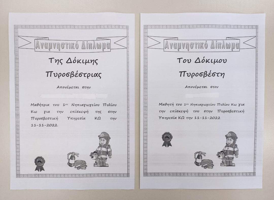 Τέλος όλα τα παιδιά έριξαν νερό με τη μάνικα και πήραν από έναν χυμό και ένα δίπλωμα δόκιμου πυροσβέστη/δόκιμης πυροσβέστριας.