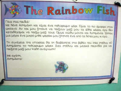 Το πρωί που ήρθαμε σχολείο στην παρεούλα βρήκαμε ένα γράμμα και ένα βιβλίο. Ήταν από τον Ασημάκη, το πολύχρωμο ψαράκι. Αφού διαβάσαμε το βιβλίο «Ο Ασημάκης το πολύχρωμο ψαράκι», συζητήσαμε για τη στάση του Ασημάκη και για τη φιλία. Προτείναμε φιλικές και μη φιλικές συμπεριφορές, τις ταξινομήσαμε, δοκιμάσαμε να παίξουμε με καινούριους φίλους στο σχολείο, φτιάξαμε το βραχιολάκι της φιλίας