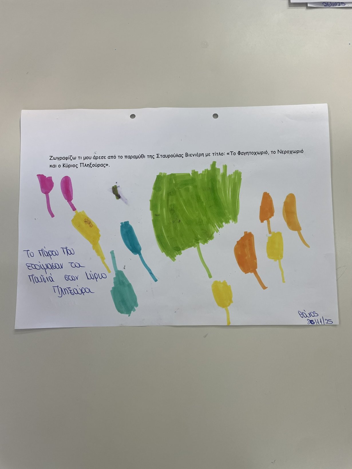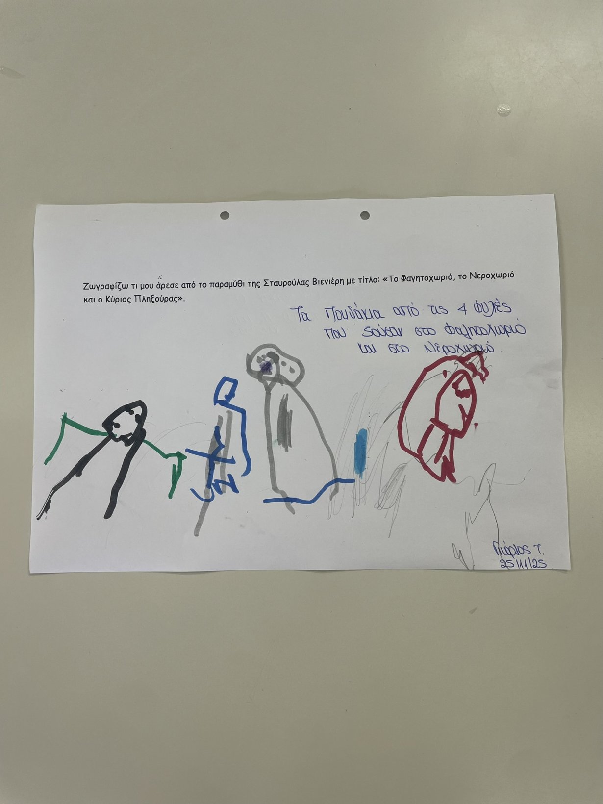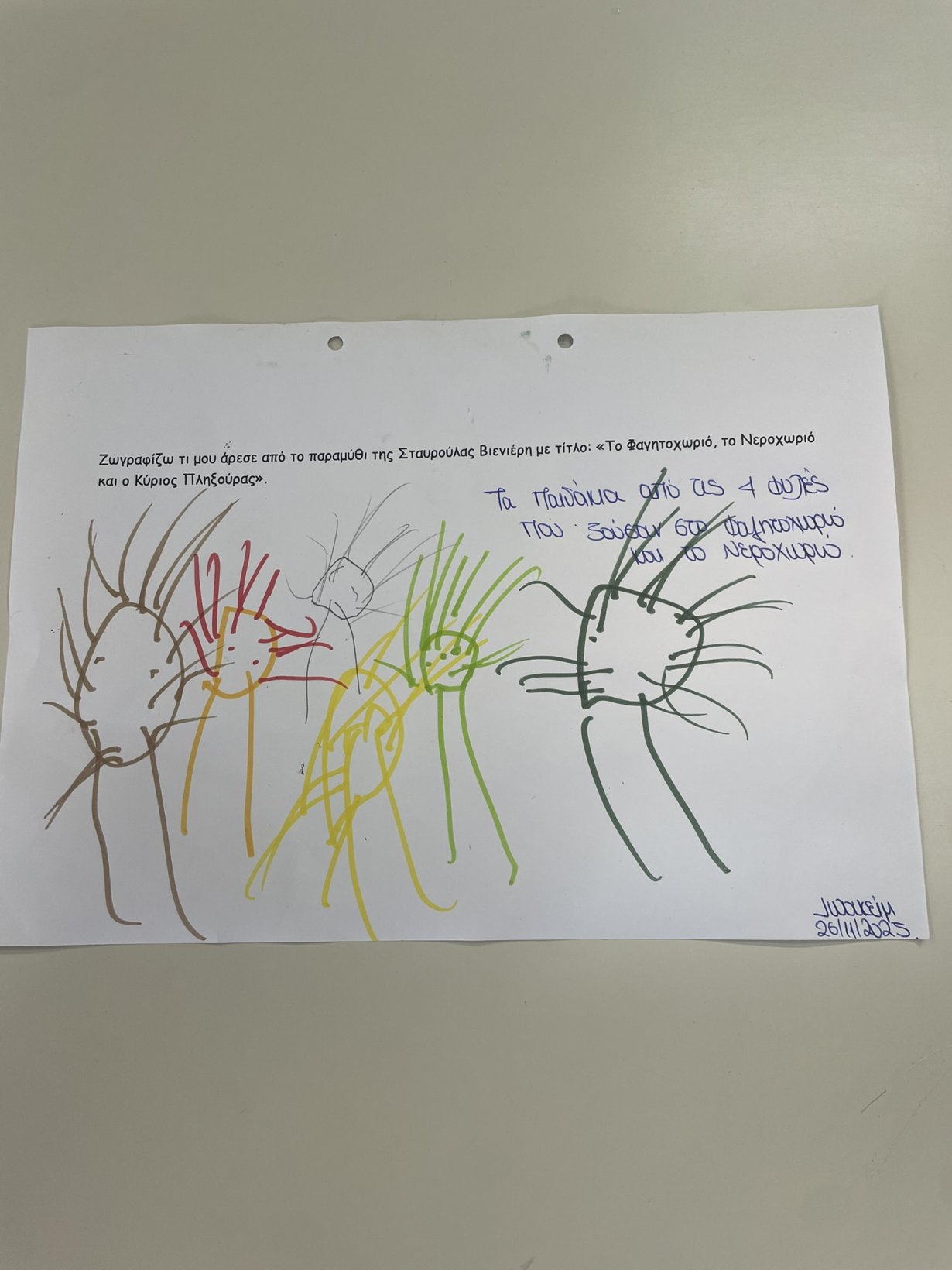 Τα παιδιά άκουσαν με μεγάλη προσοχή την περιπέτεια του μικρού ήρωα και συζητήσαμε όλοι μαζί για τα συναισθήματα που νιώθουμε όταν αποχωριζόμαστε τους γονείς το πρωί, αλλά και για τους τρόπους με τους οποίους μπορούμε να νιώθουμε ασφάλεια και ζεστασιά ακόμη κι όταν είμαστε στο σχολείο.