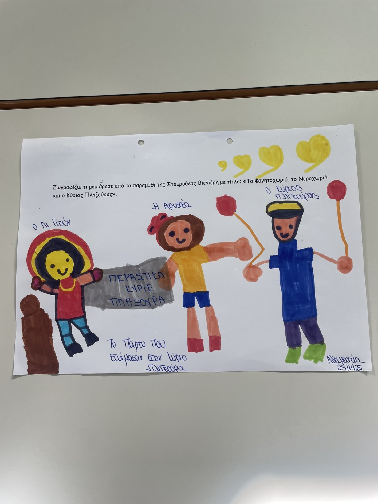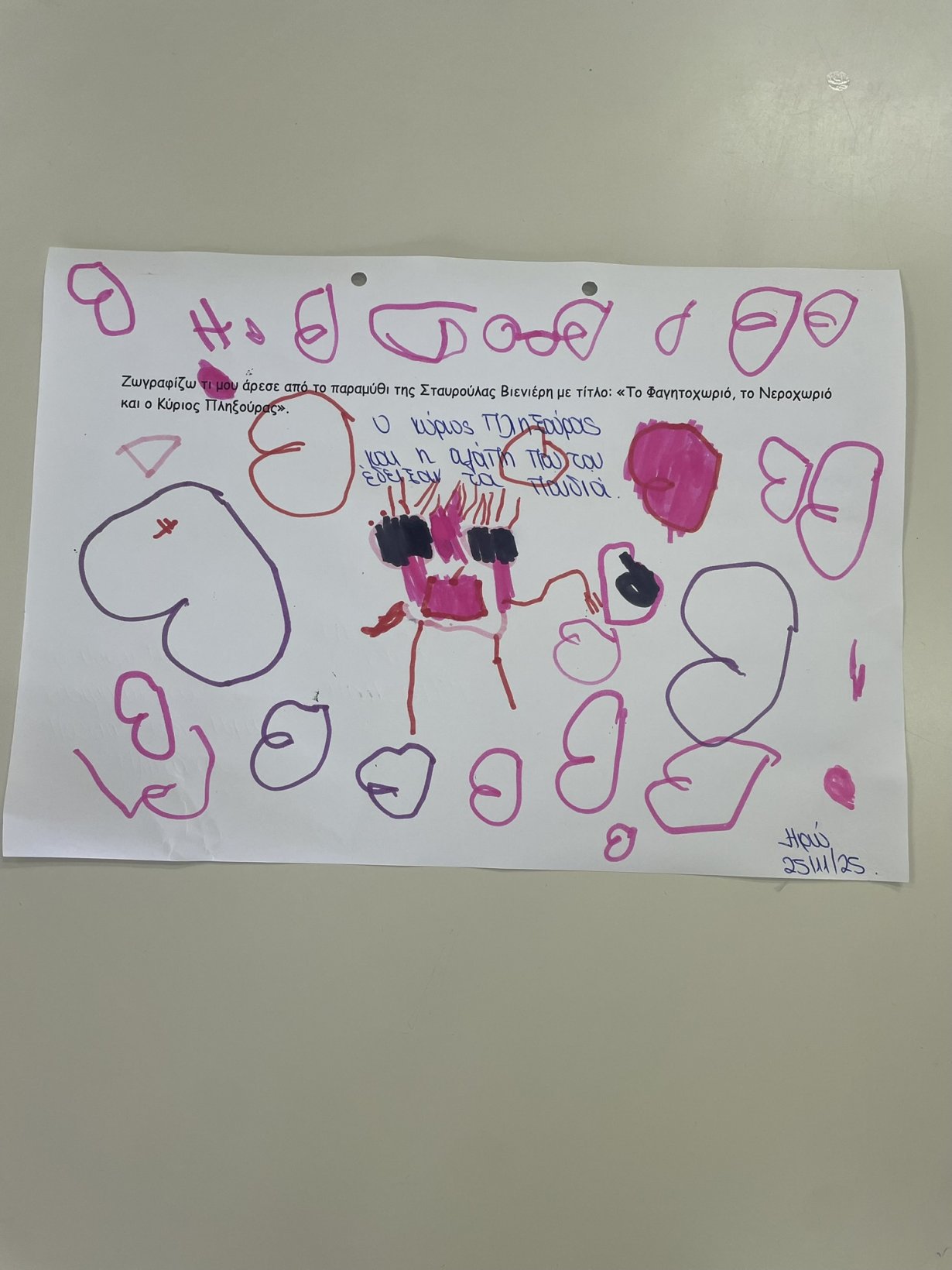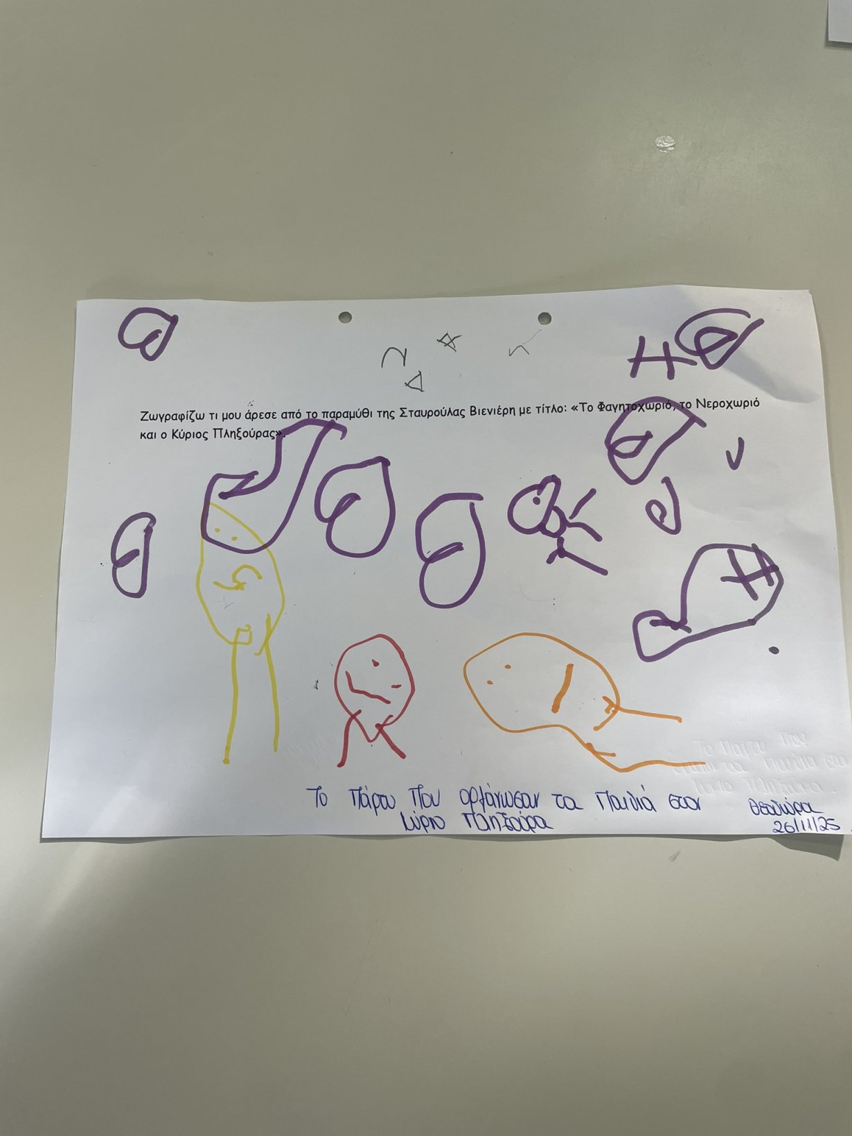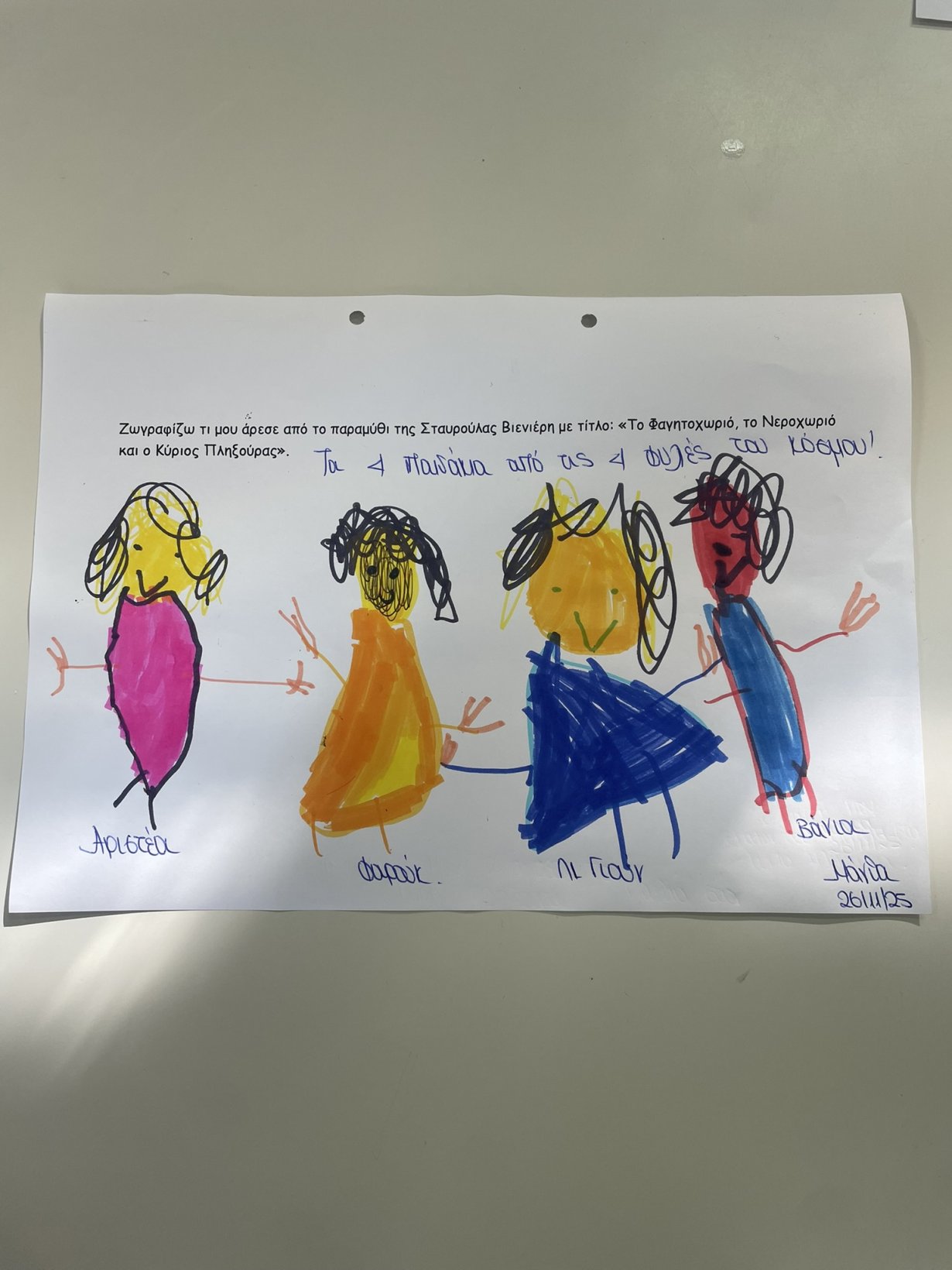 Τα παιδιά άκουσαν με μεγάλη προσοχή την περιπέτεια του μικρού ήρωα και συζητήσαμε όλοι μαζί για τα συναισθήματα που νιώθουμε όταν αποχωριζόμαστε τους γονείς το πρωί, αλλά και για τους τρόπους με τους οποίους μπορούμε να νιώθουμε ασφάλεια και ζεστασιά ακόμη κι όταν είμαστε στο σχολείο.