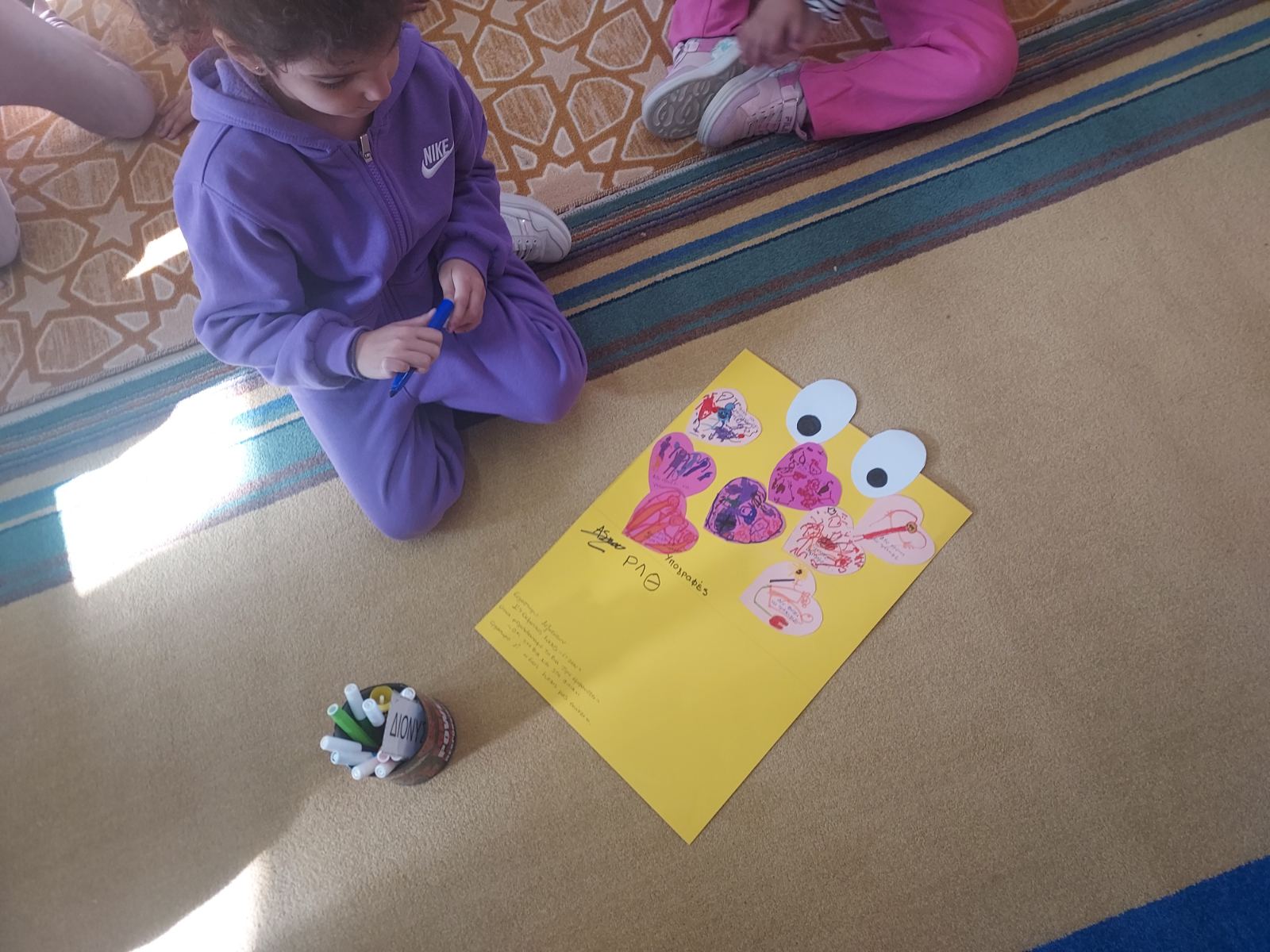 Στην παρεούλα τα παιδιά συζητούν μεταξύ τους τι κάνουν καλά, τι τους αρέσει να κάνουν, τι τα κάνει να νιώθουν όμορφα, για τι αισθάνονται περήφανα. Στη συνέχεια, σχεδιάζουν τις παλάμες τους και ζωγραφίζουν όσα συζήτησαν.