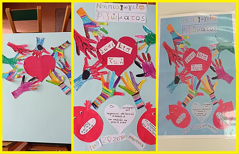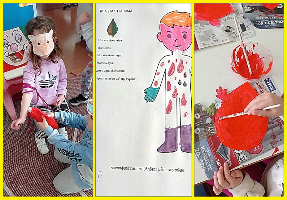 Με αφετηρία την ιστορία «Τι ζητούσε μια φορά η αλεπού στη ρεματιά;» ξεκίνησε ένα μεγάλο ταξίδι στην ενότητα της εθελοντικής αιμοδοσίας. Αφού διαβάσαμε την ιστορία τη δραματοποιήσαμε και διασκεδάσαμε πολύ. Ταυτόχρονα όμως μάθαμε πόσο πολύτιμο είναι να δίνεις αίμα παρατηρώντας τα ζώα που έτρεξαν να δώσουν αίμα για τη φίλη τους την αλεπού. Έτσι στη συνέχεια αποφασίσαμε να οργανώσουμε μία εθελοντική αιμοδοσία! Συνεργαστήκαμε και φτιάξαμε μια αφίσα την οποία και κολλήσαμε σε διάφορα σημεία του χωριού μας, στο νοσοκομείο Τρικάλων και φυσικά πήραμε και όλοι μας μία ενθύμιο στο σπίτι!