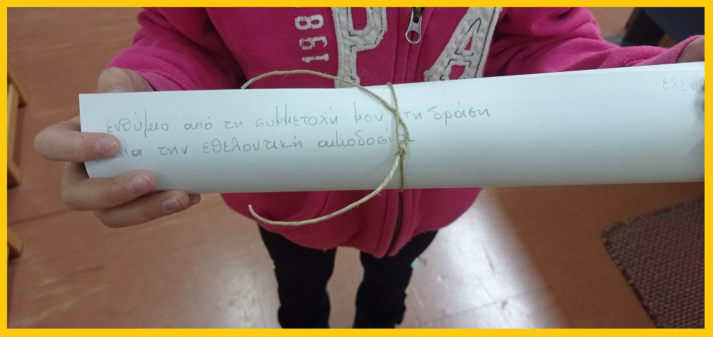 Στο πλαίσιο της προσφοράς και του εθελοντισμού και με αφορμή την ιστορία «Η ΠΑΠΛΩΜΑΤΟΥ» η οποία έδινε τα παπλώματά της σε όποιον είχε ανάγκη συγκεντρώσαμε τρόφιμα να τα δώσουμε και εμείς σε όποιον είχε ανάγκη! Το χαρήκαμε πολύ και μάθαμε ότι είναι ωραίο να βοηθάμε τους άλλους!