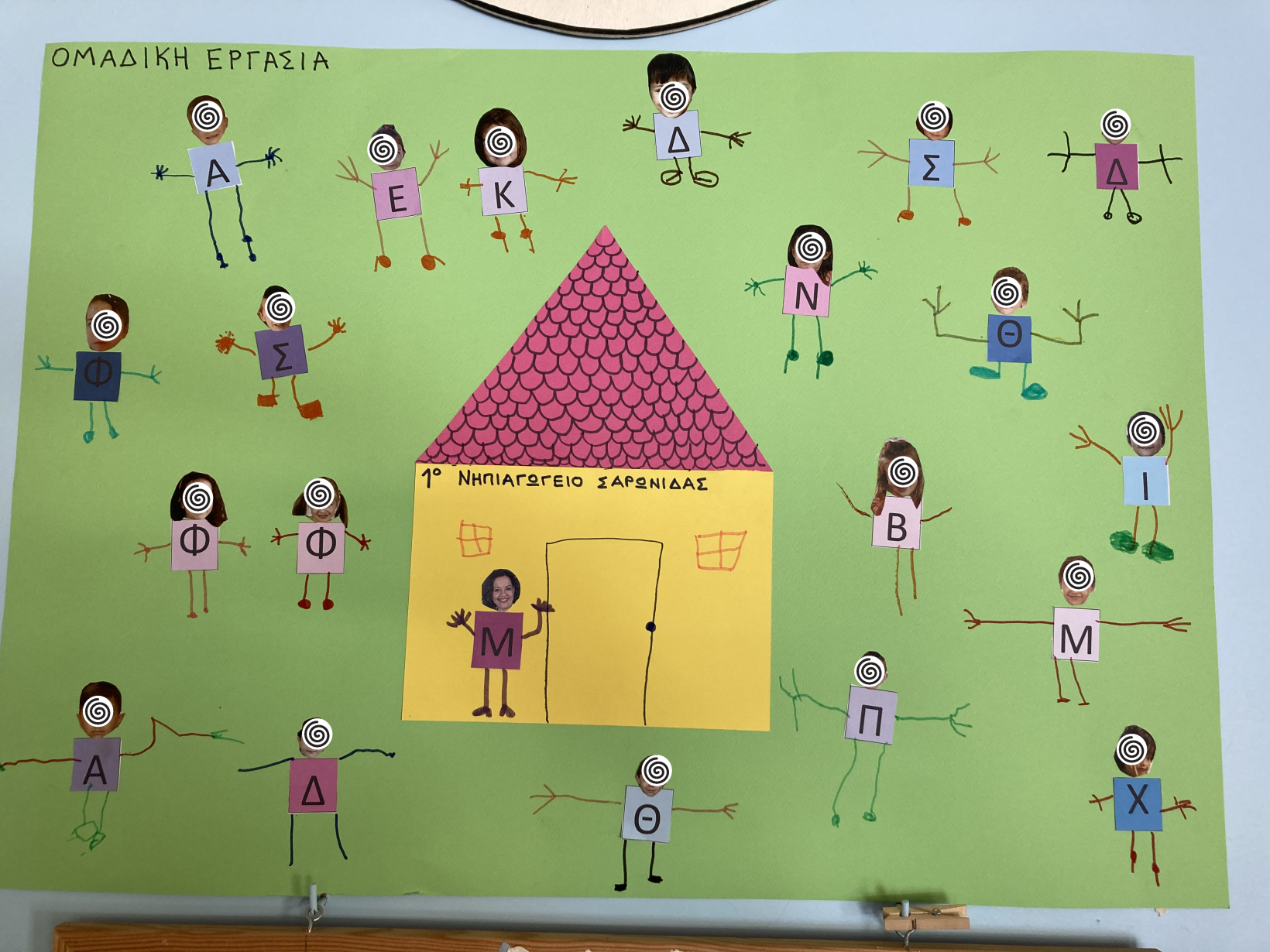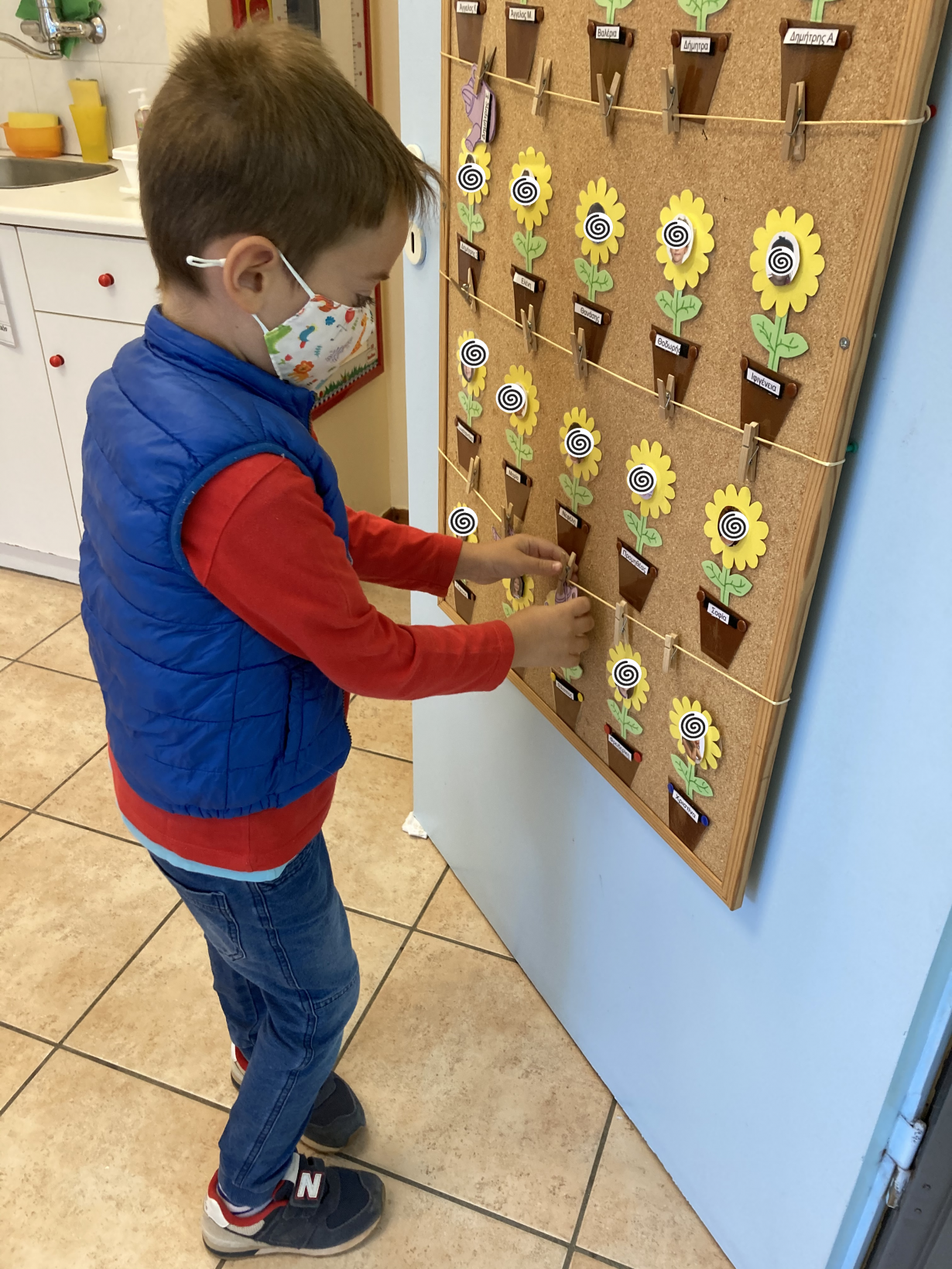 Στη συνέχεια, προχωρήσαμε σε ένα εκπαιδευτικό παιχνίδι, όπου γράψαμε πάνω στους καθρέφτες τα ονόματα των παιδιών και τα καλέσαμε να αντιστοιχίσουν τα μανταλάκια με τα γράμματα του ονόματός τους πάνω στον καθρέφτη τους. Το παιχνίδι αυτό ενισχύει την αναγνώριση γραμμάτων, τη λεπτή κινητικότητα, και παράλληλα τονίζει την αξία της αυτογνωσίας, καθώς τα παιδιά μαθαίνουν να αναγνωρίζουν και να εκφράζουν τον εαυτό τους.