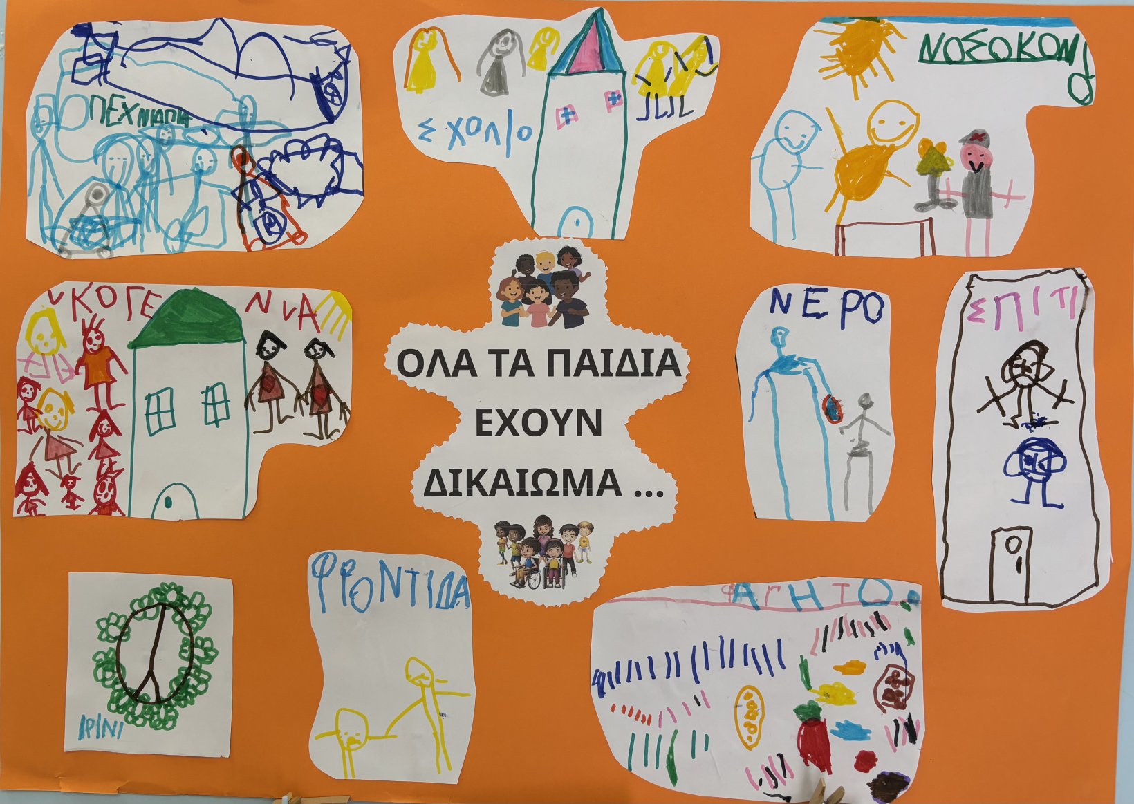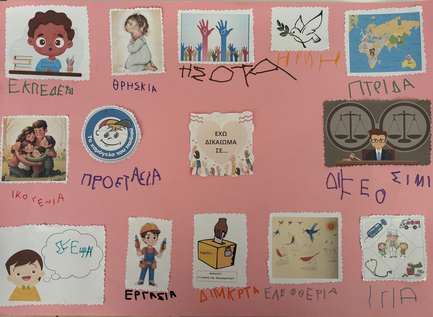 Μιλήσαμε για τις ανάγκες που έχει κάθε παιδί (τροφή, φροντίδα, εκπαίδευση, παιχνίδι), παρατηρήσαμε εικόνες, κάναμε αντιστοιχίσεις και μάθαμε τη διαφορά ανάμεσα στο “θέλω” και στο “χρειάζομαι”. Ζωγραφίσαμε τα δικαιώματα των παιδιών και φτιάξαμε αφίσα.
