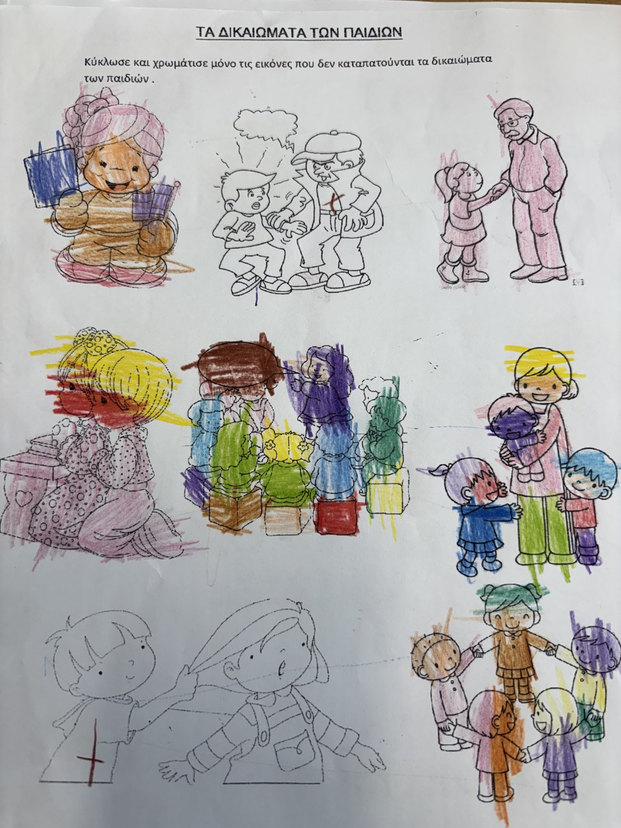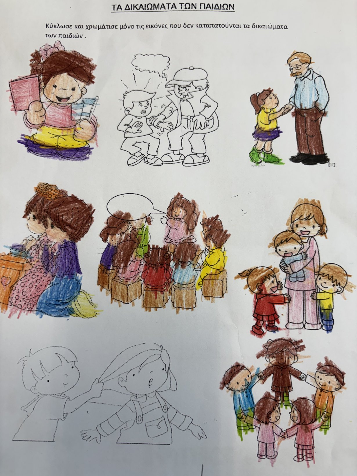 Παίξαμε θέατρο ρόλων με σενάρια από τη ζωή των παιδιών και υποστηρίξαμε με επιχειρήματα τα δικαιώματά μας. Συμπληρώσαμε φύλλο εργασίας στο οποίο χρωματίσαμε τις εικόνες που δεν καταπατούνται τα δικαιώματα των παιδιών.