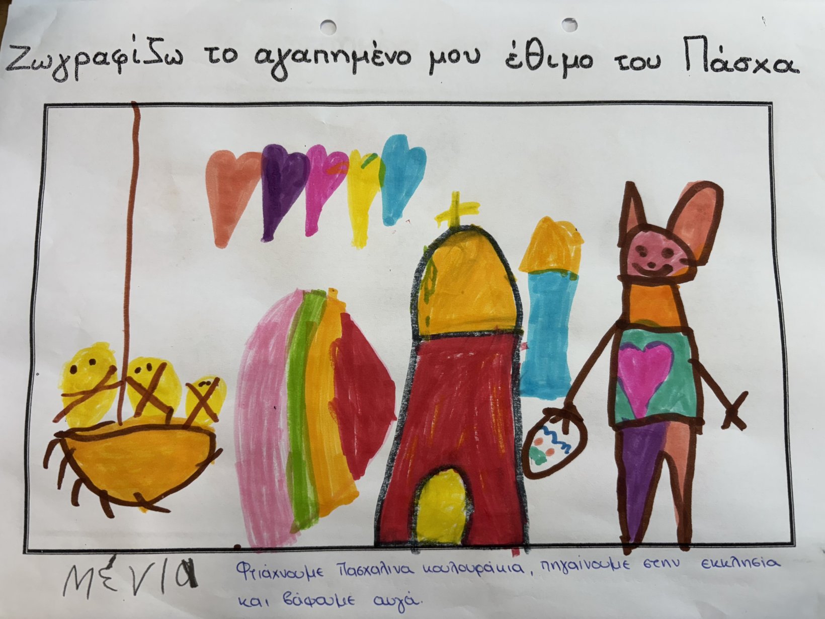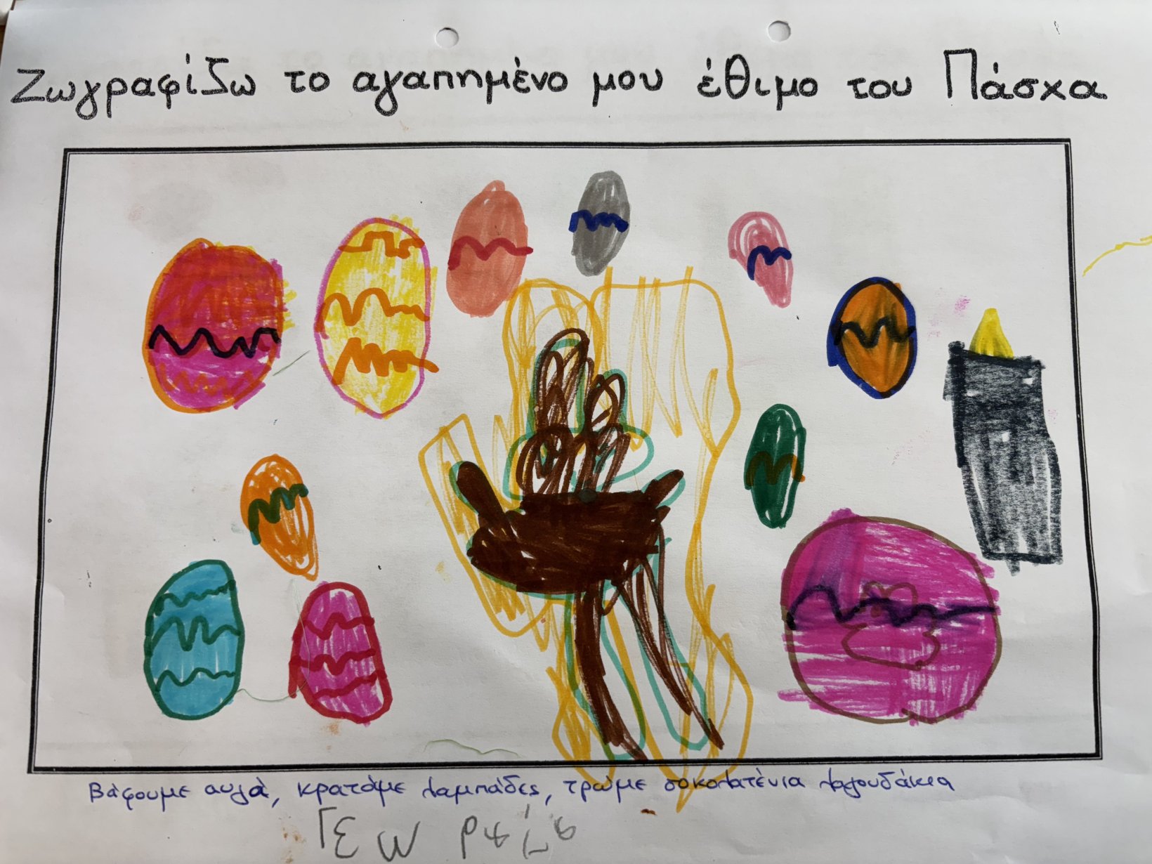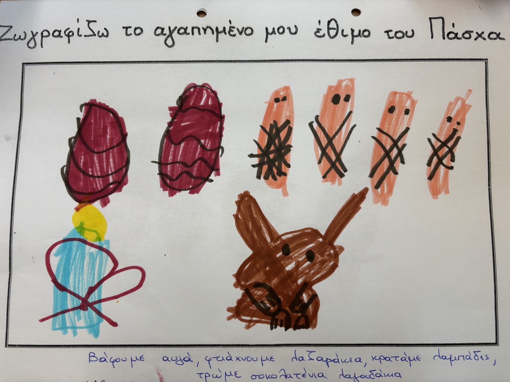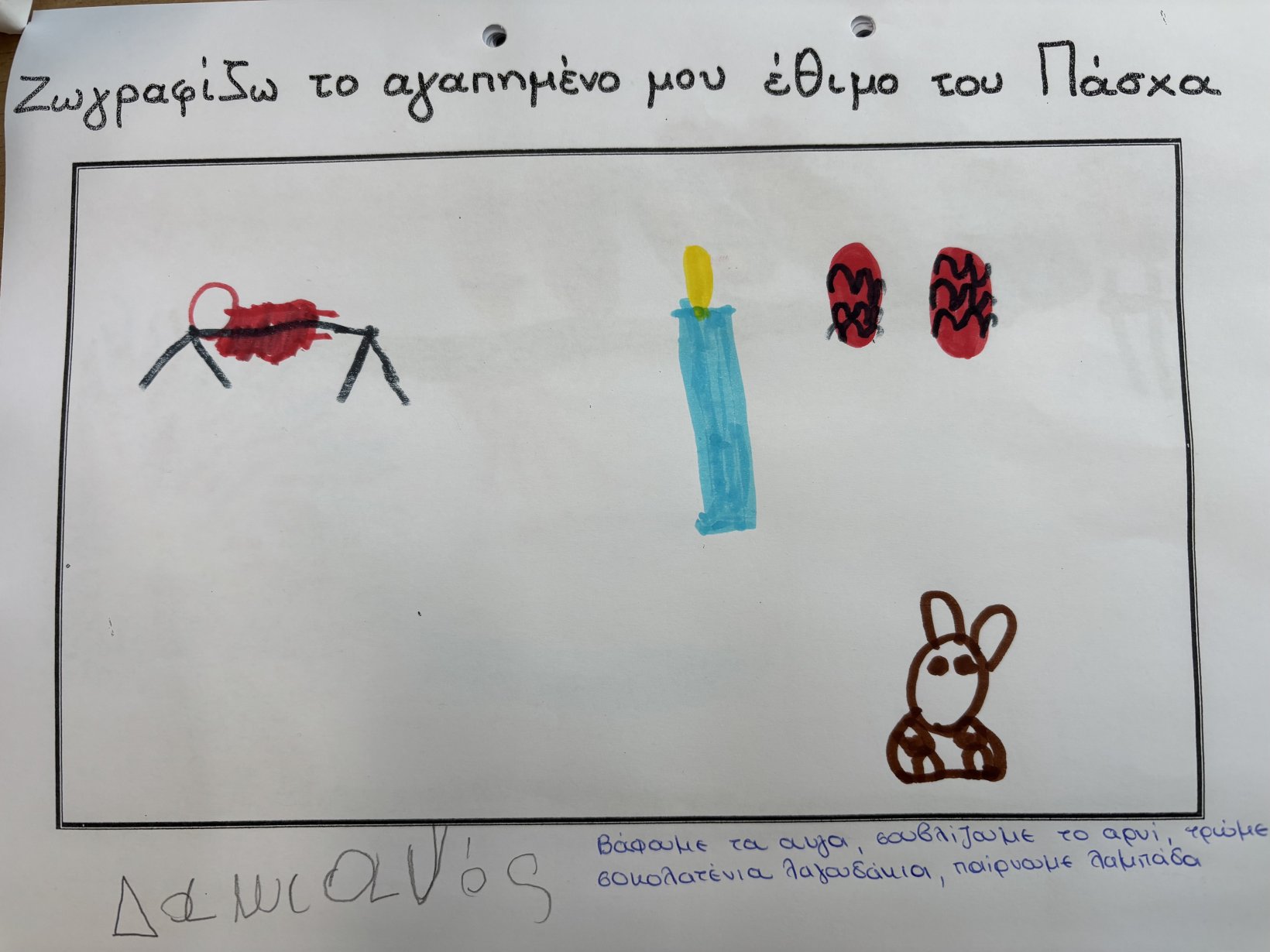 Μιλήσαμε για την ιστορία του Πάσχα, την είδαμε σε βίντεο και στη συνέχεια γνωρίσαμε όμορφα έθιμα που συνοδεύουν αυτές τις μέρες. Τα παιδιά ζωγράφισαν το αγαπημένο τους έθιμο!